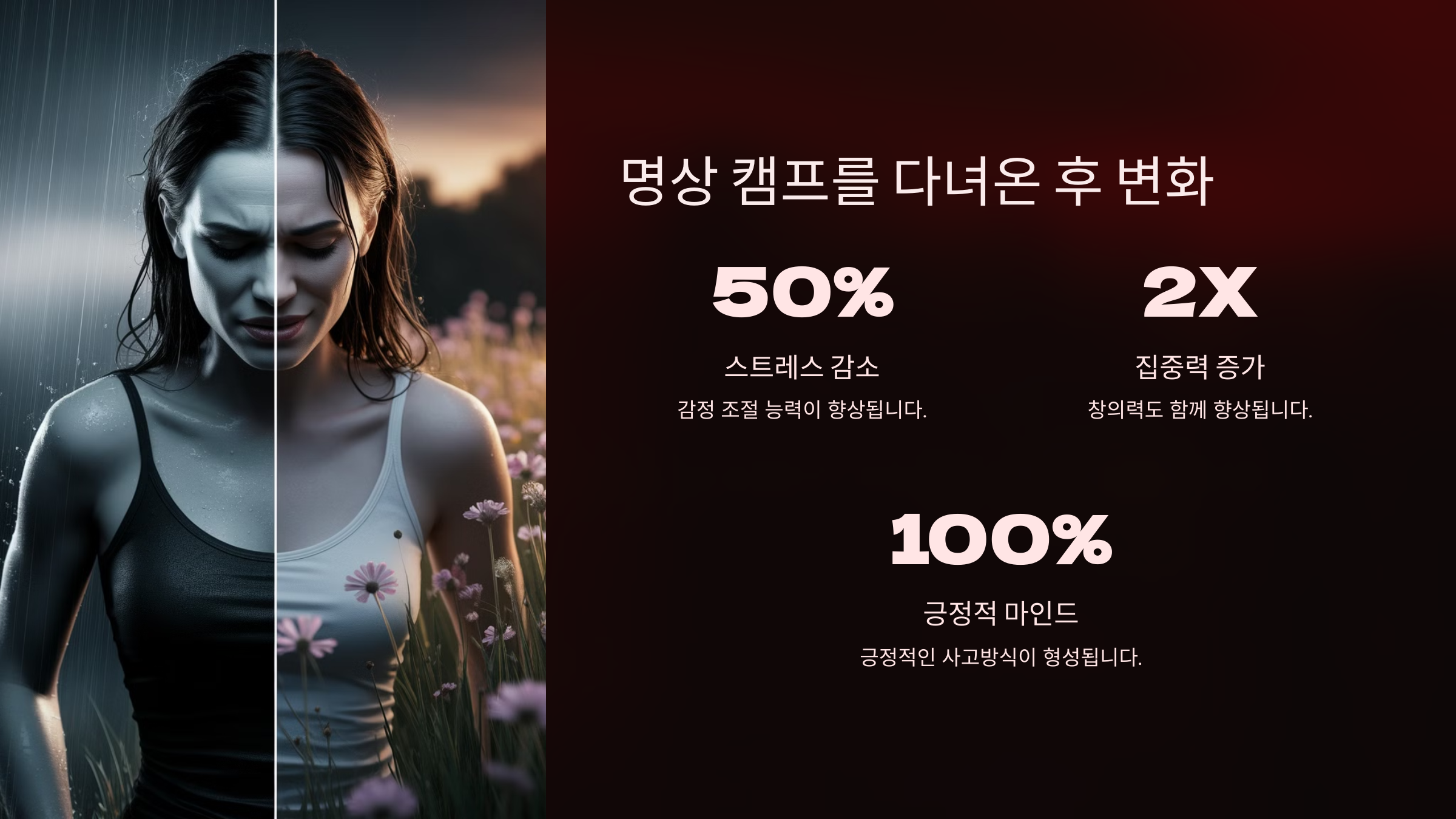 자기 계발 명상캠프는 단순한 휴식이 아니라, 자기 탐색과 내면 성장의 기회를 제공하는 프로그램입니다. 그렇다면, 자기 계발 명상캠프는 어떤 효과를 주고, 어떤 기대를 할 수 있을까요?