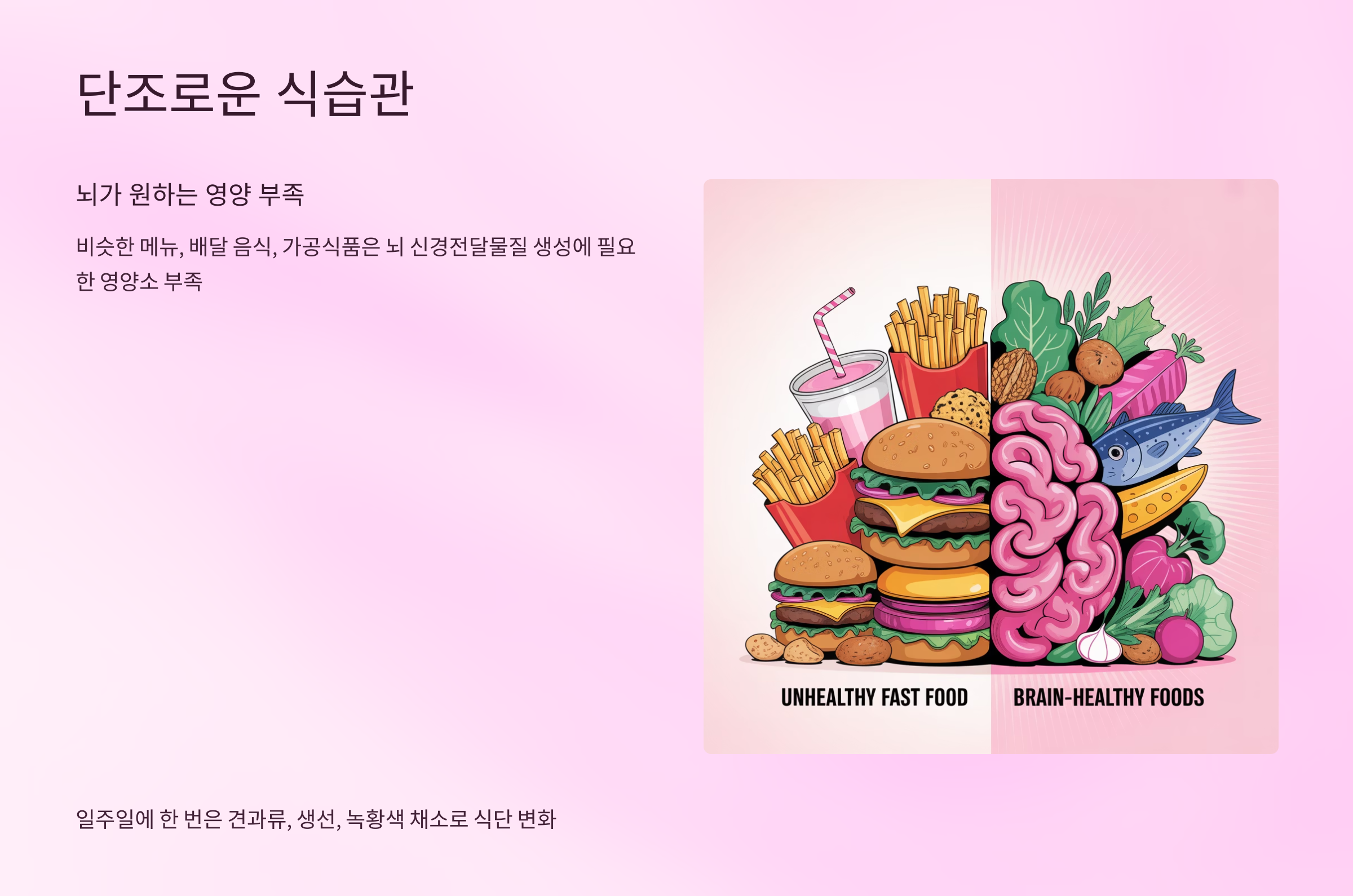 매번 비슷한 메뉴, 배달 음식, 가공식품 중심의 식습관은 뇌신경전달물질을 만드는 영양소를 충분히 공급하지 못합니다. 결과적으로 집중력 저하와 기억력 약화를 부릅니다.