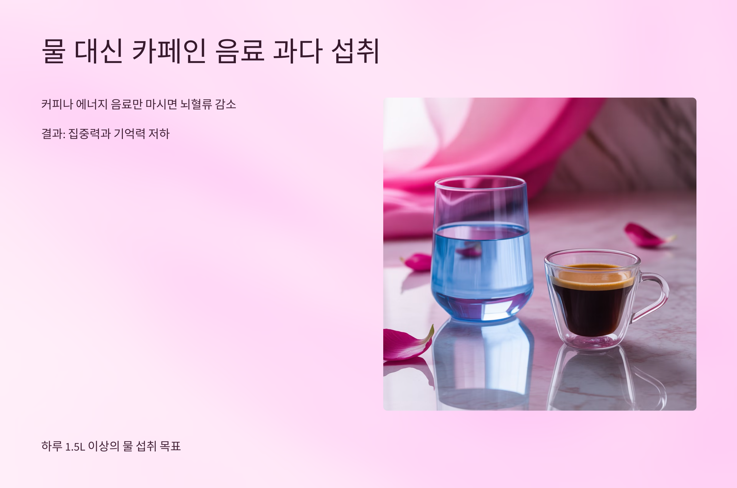 커피나 에너지 음료만 마시고 물을 충분히 안 마시면 뇌혈류가 떨어져 집중력과 기억력이 저하됩니다.