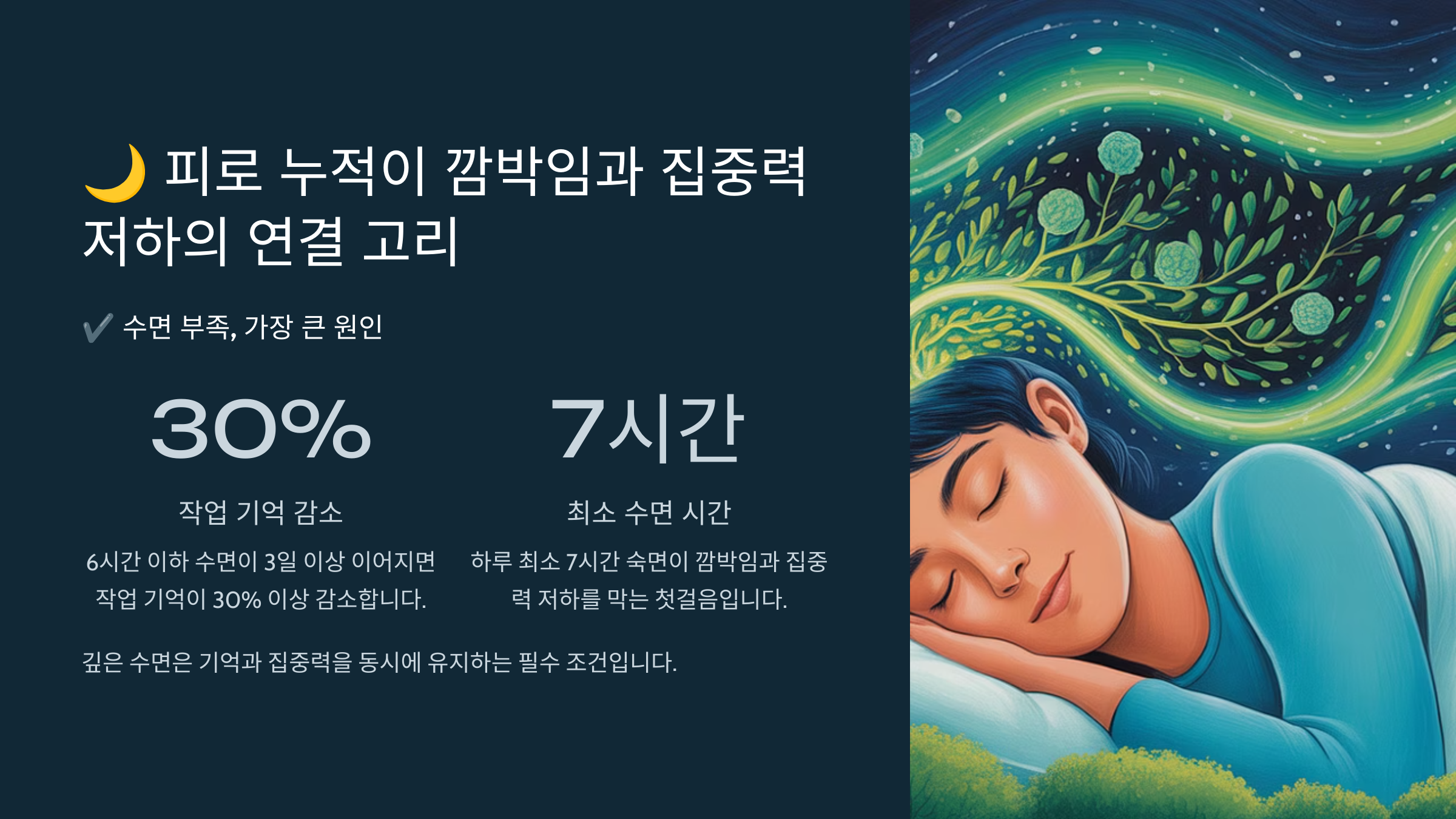 깊은 수면은 기억과 집중력을 동시에 유지하는 필수 조건입니다.