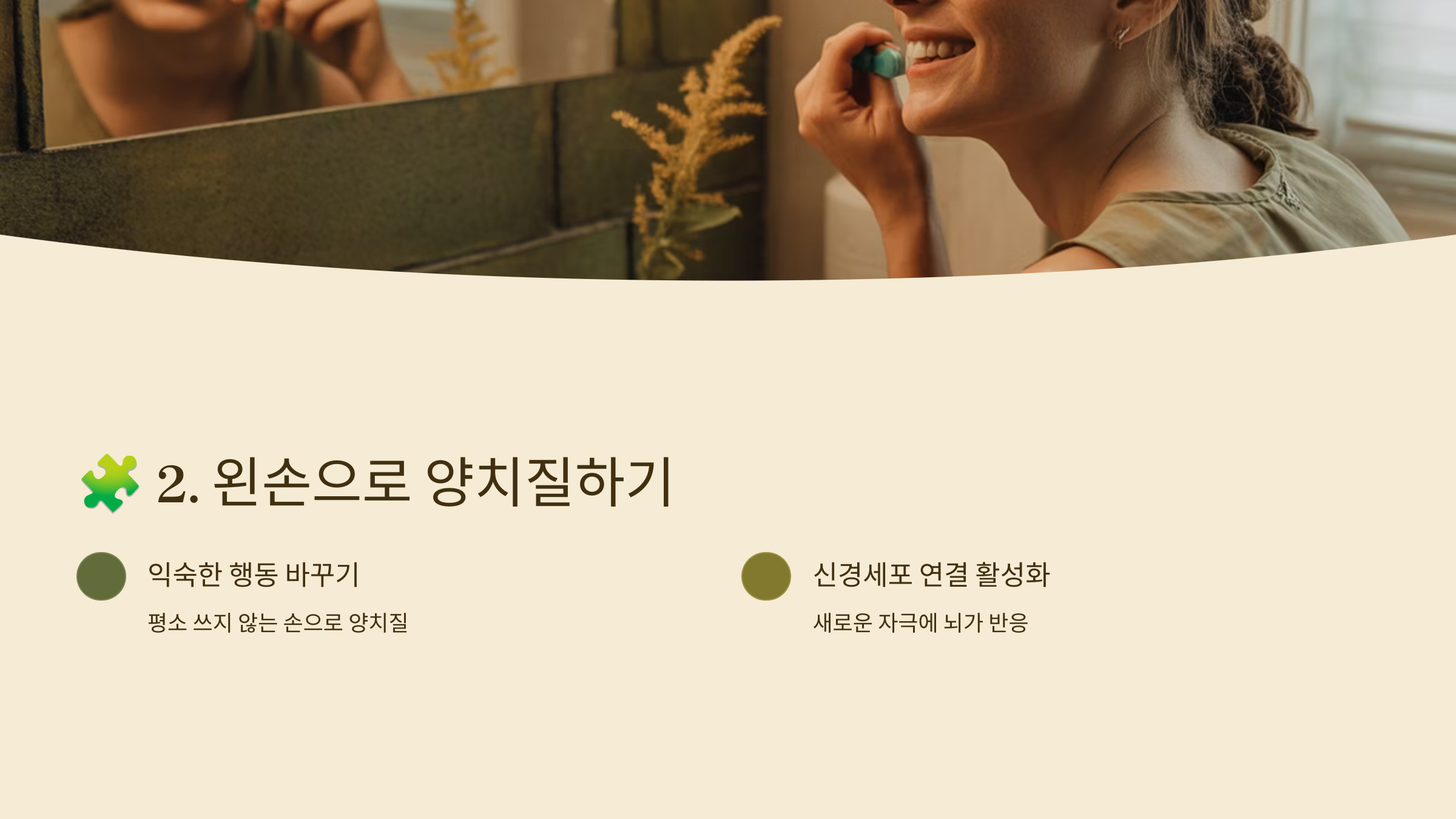 매일 하는 양치질을 평소 쓰지 않는 손으로 해보세요. 뇌는 새로운 자극에 반응하며 신경세포 연결이 활발해집니다. 작은 불편이 기억력 감퇴를 늦추는 자극이 됩니다.