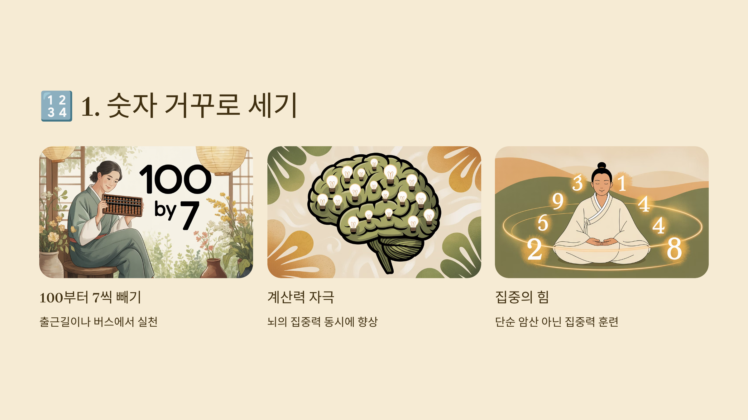 출근길이나 버스에서 100부터 7씩 거꾸로 세어보세요. 간단하지만 뇌의 계산력과 집중력을 동시에 자극합니다. 매일 달라지는 수열은 뇌를 깨우는 최고의 활동입니다.