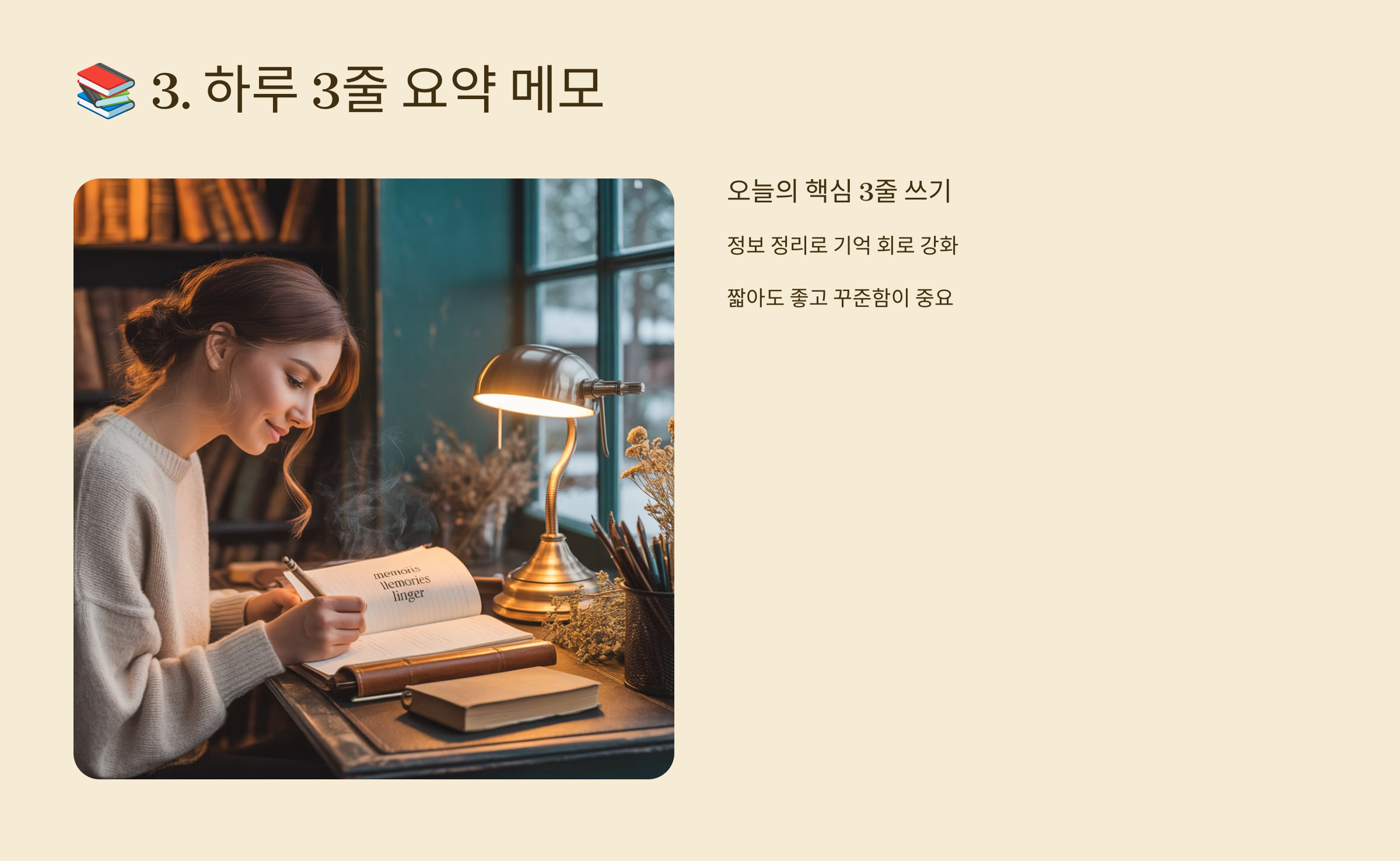 하루 일과를 단 3줄로 요약해 보세요. 뇌는 정보를 정리하며 기억 회로를 다시 강화합니다. 짧아도 좋습니다. 꾸준함이 중요합니다.