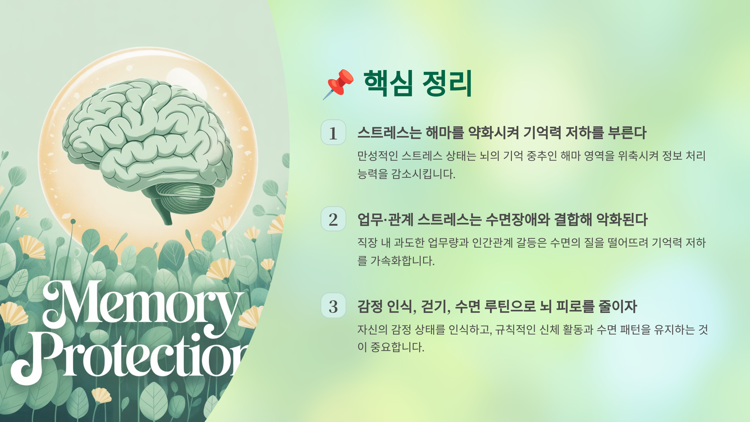 업무 과부하, 대인관계 갈등, 잦은 야근은 스트레스를 극대화시킵니다. 특히 수면장애와 결합되면 기억력 저하는 더 빠르게 진행됩니다.
