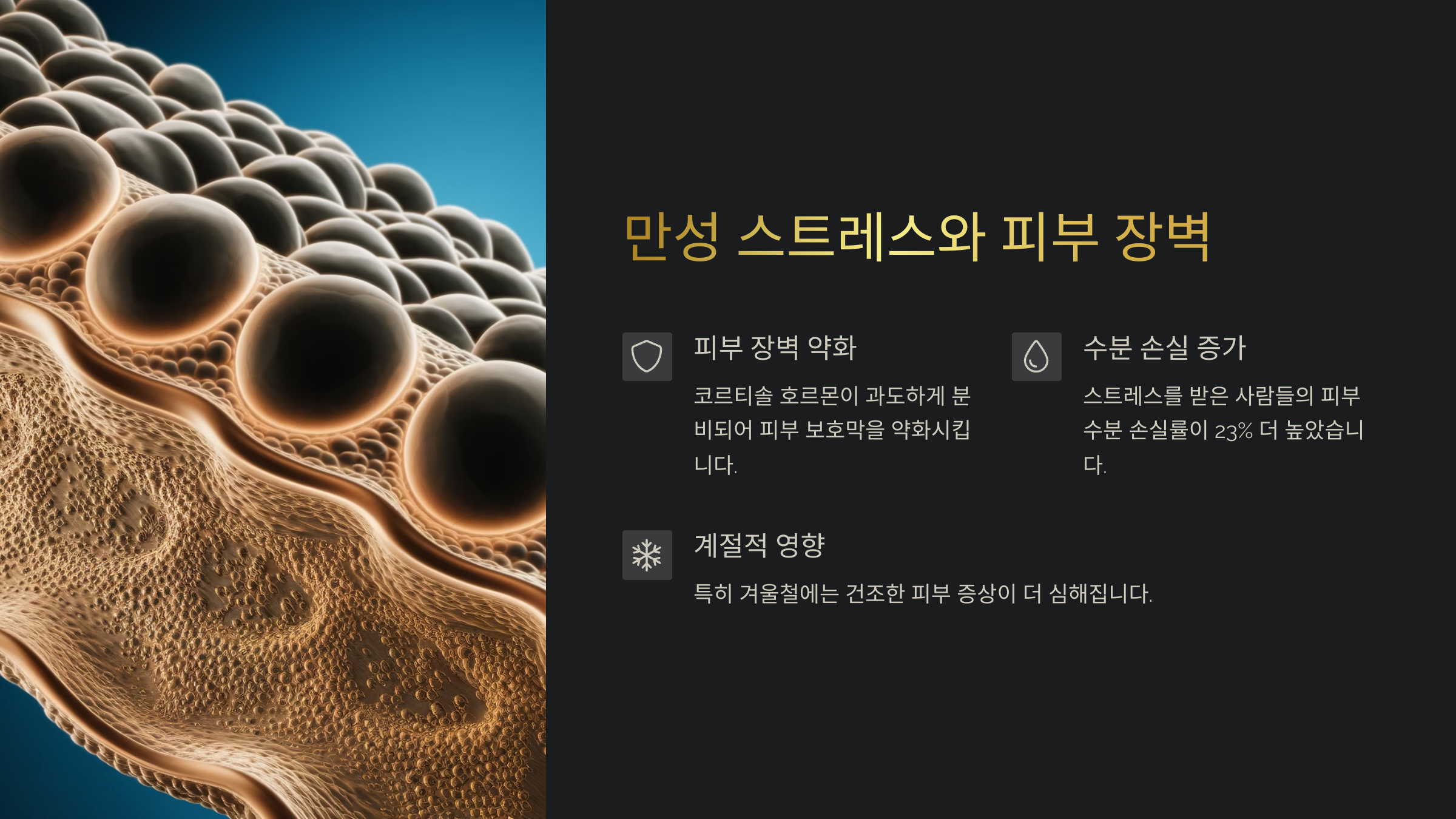 스트레스가 쌓이면 코르티솔이라는 호르몬이 과도하게 분비되는데, 이 호르몬은 피부의 보호막인 '피부 장벽'을 약하게 만들어 외부 자극에 더 쉽게 노출되도록 합니다. 실제 한 연구에서는, 스트레스를 받은 사람들의 피부 수분 손실률이 23% 더 높았다는 결과도 있습니다. 특히 겨울철에는 푸석푸석하고 건조한 피부 증상이 더 심해지는 경향이 있습니다.