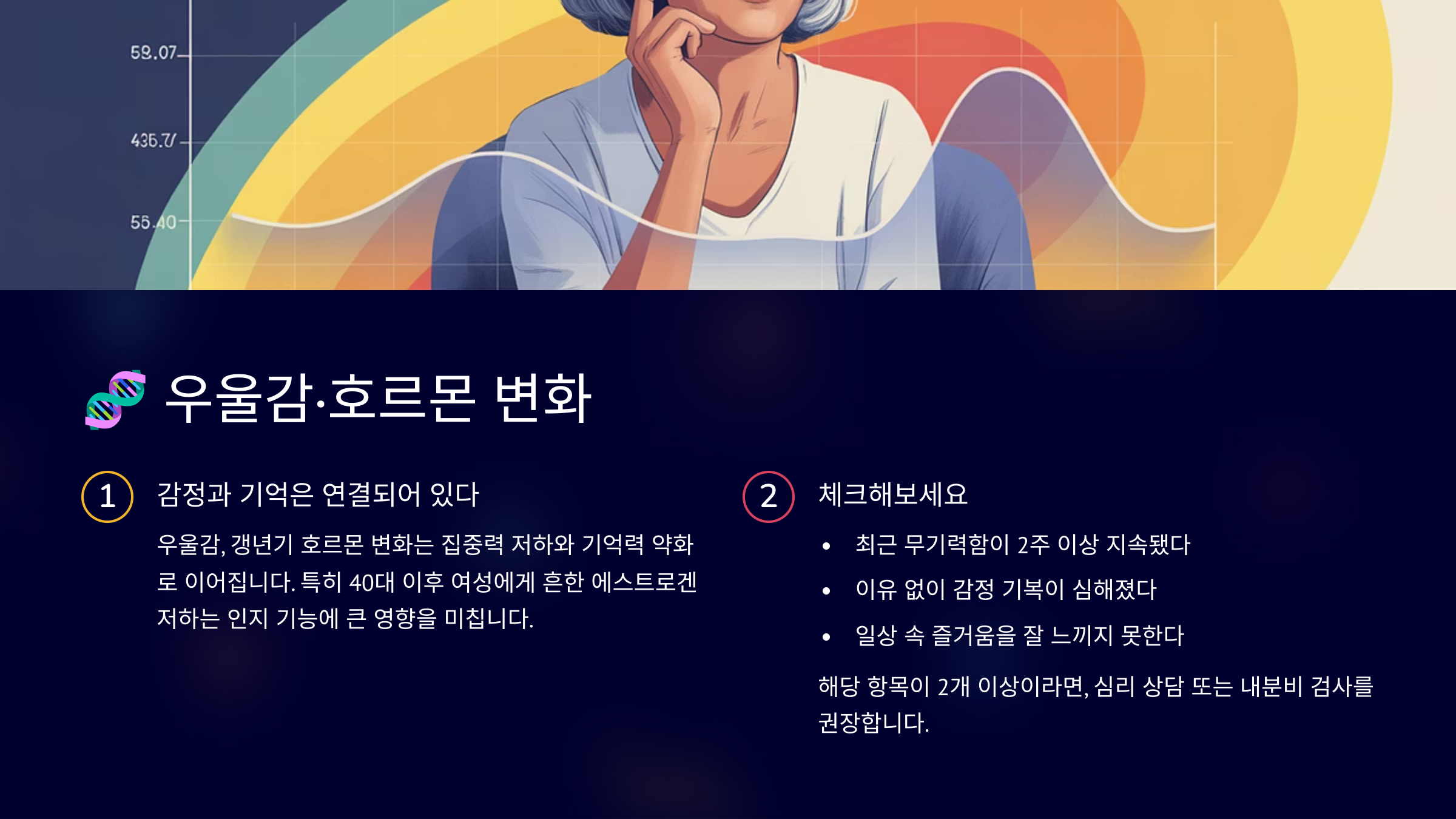 우울감, 갱년기 호르몬 변화는 **집중력 저하와 기억력 약화**로 이어집니다. 특히 40대 이후 여성에게 흔한 **에스트로겐 저하는 인지 기능에 큰 영향을 미칩니다.**