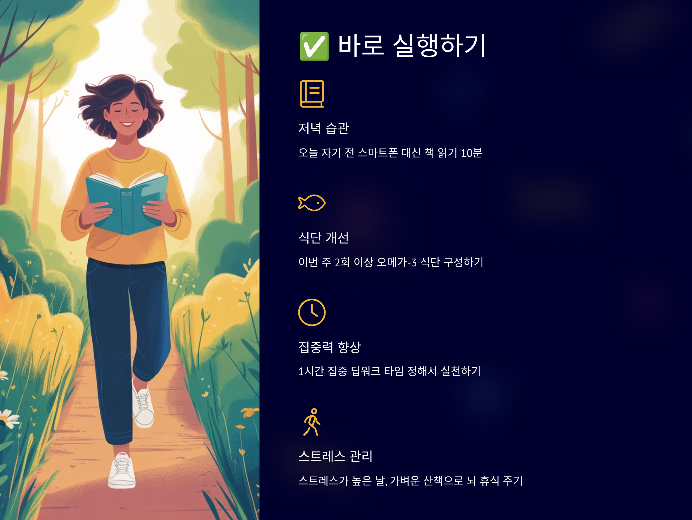 • [ ] 스트레스가 높은 날, 가벼운 산책으로 뇌 휴식 주기