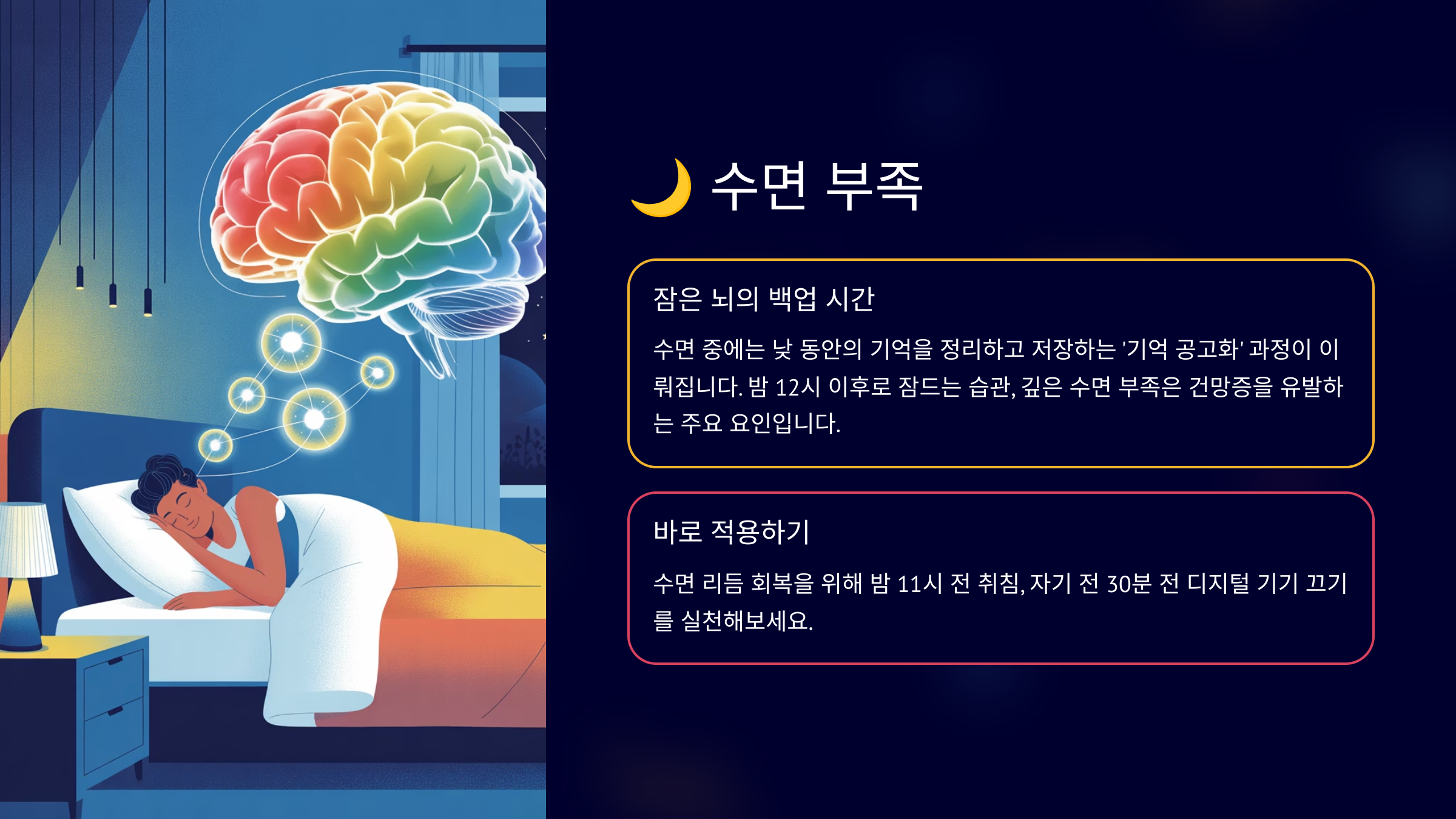수면 중에는 낮 동안의 기억을 정리하고 저장하는 ‘기억 공고화’ 과정이 이뤄집니다. **밤 12시 이후로 잠드는 습관, 깊은 수면 부족은 건망증을 유발하는 주요 요인**입니다.