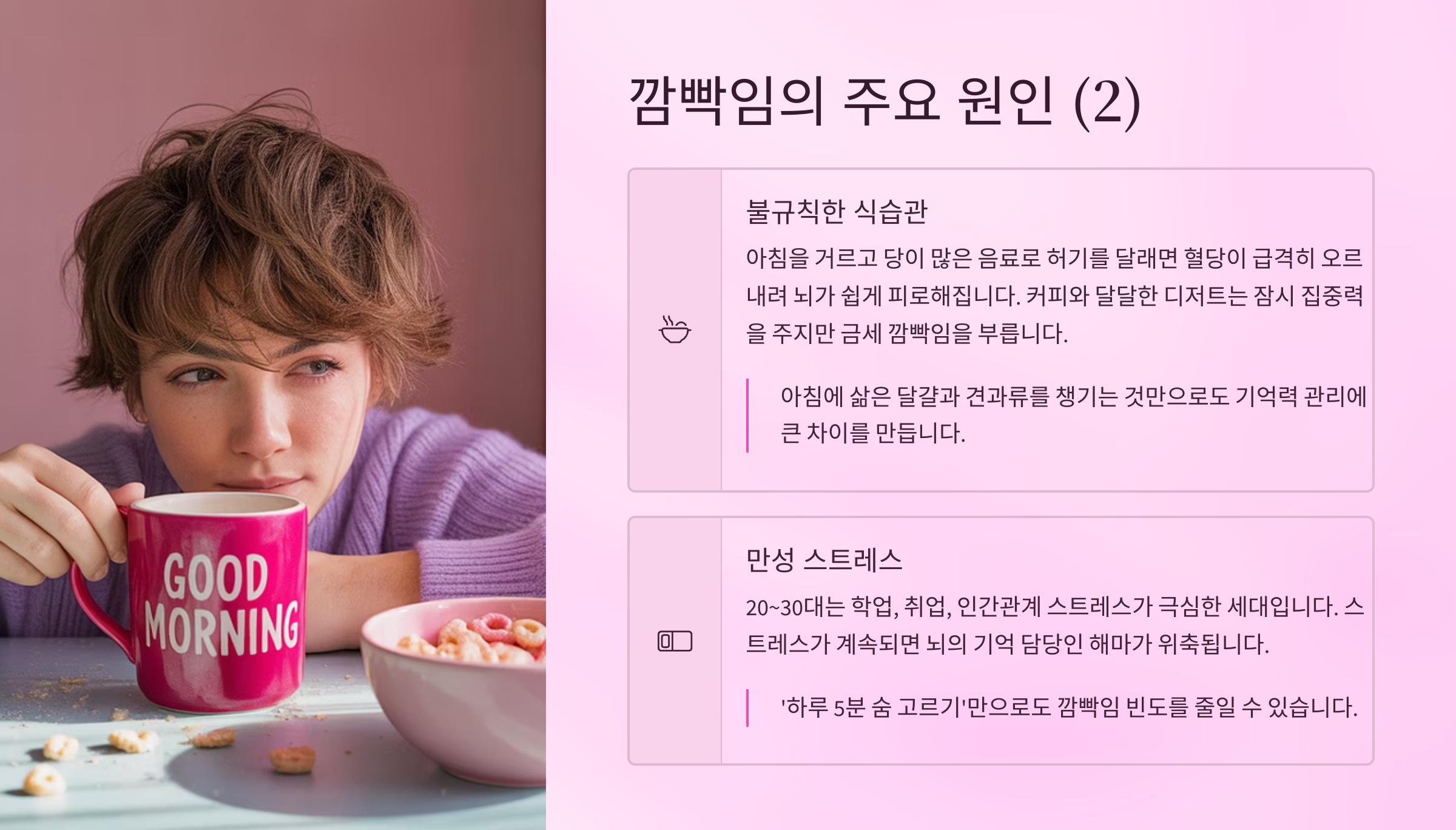 - 작은 루틴 교정으로도 기억력 저하를 크게 줄일 수 있다