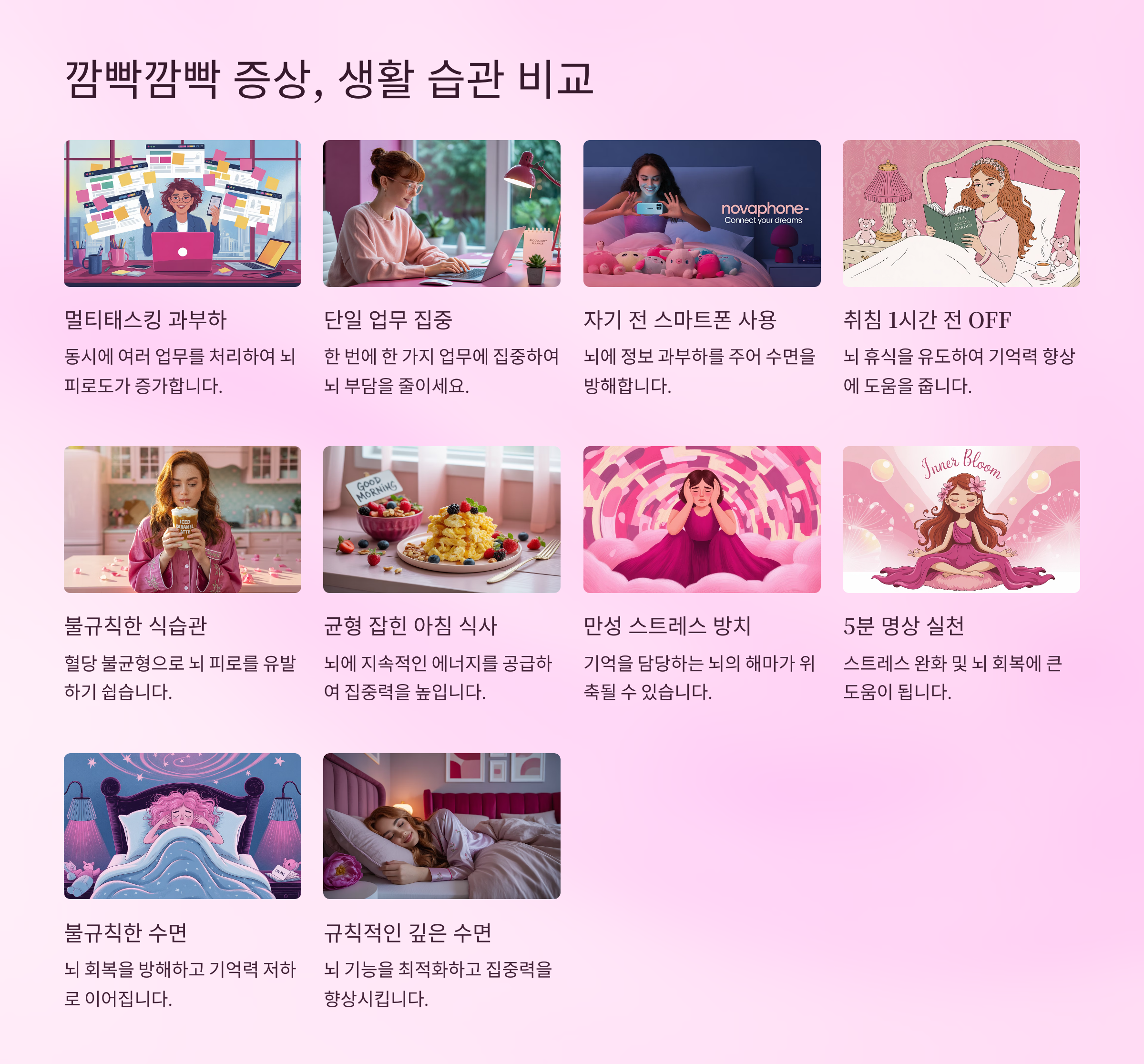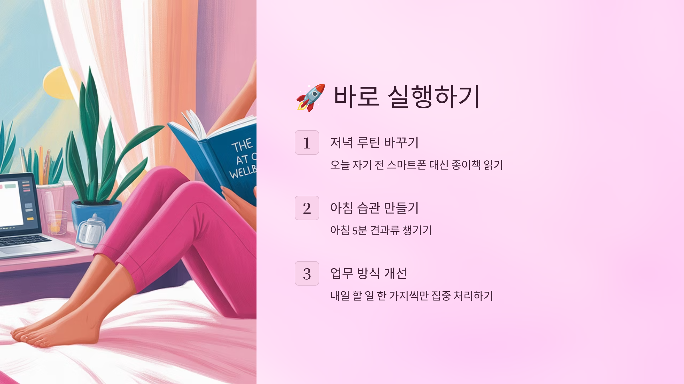 > 5분 명상이나 숨 고르기 루틴으로 두뇌에 휴식을 주세요.