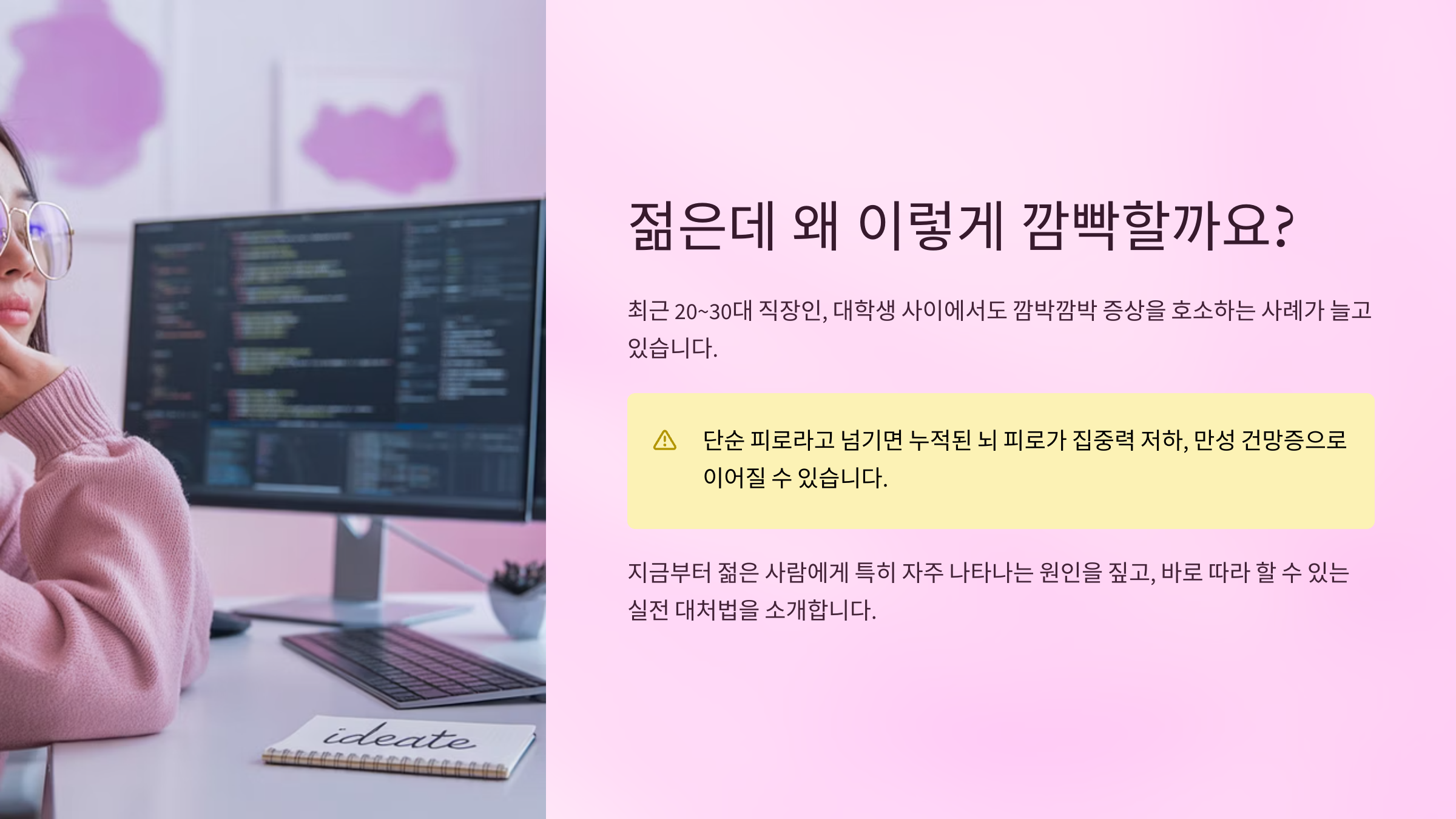 최근 20~30대 직장인, 대학생 사이에서도 깜박깜박 증상을 호소하는 사례가 늘고 있습니다.