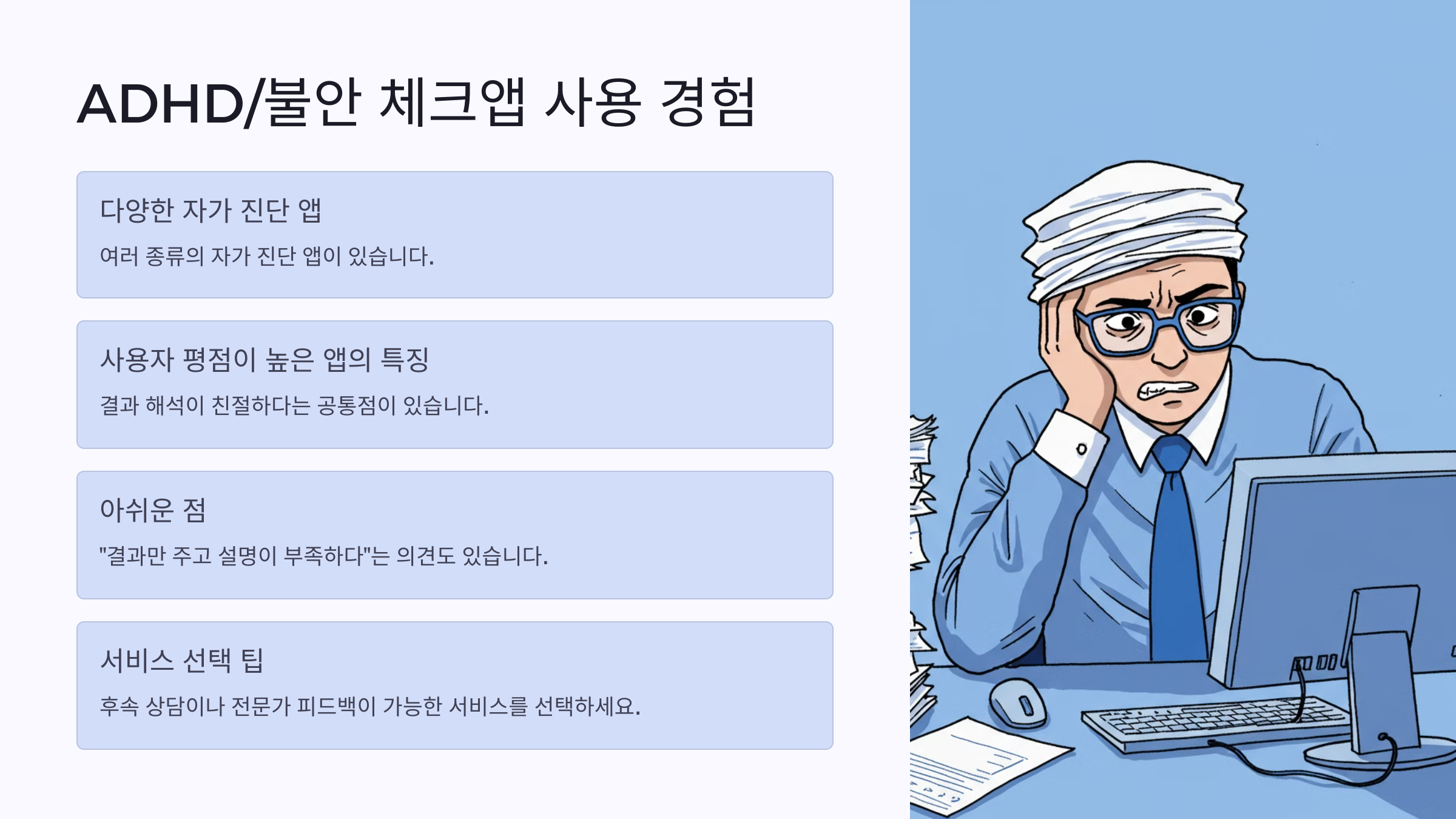 다양한 자가 진단 앱이 있지만, 사용자 평점이 높은 앱은 대부분 결과 해석이 친절하다는 공통점이 있습니다. 반면 "결과만 주고 설명이 부족하다"는 아쉬움도 있어, 후속 상담이나 전문가 피드백이 가능한 서비스 선택이 중요합니다.