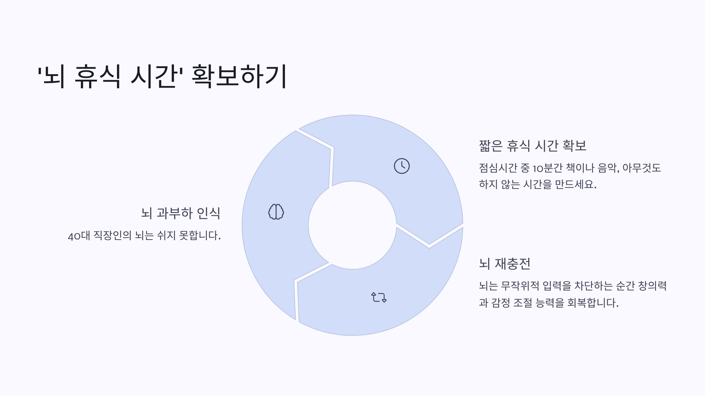 40대 직장인의 뇌는 쉬지 못합니다. 점심시간 중 10분간 책이나 음악, 아니면 아무것도 하지 않는 시간만으로도 뇌는 재충전됩니다. 뇌과학자 대니얼 레비틴은 "뇌는 무작위적 입력을 차단하는 순간 창의력과 감정 조절 능력을 회복한다"라고 말합니다.