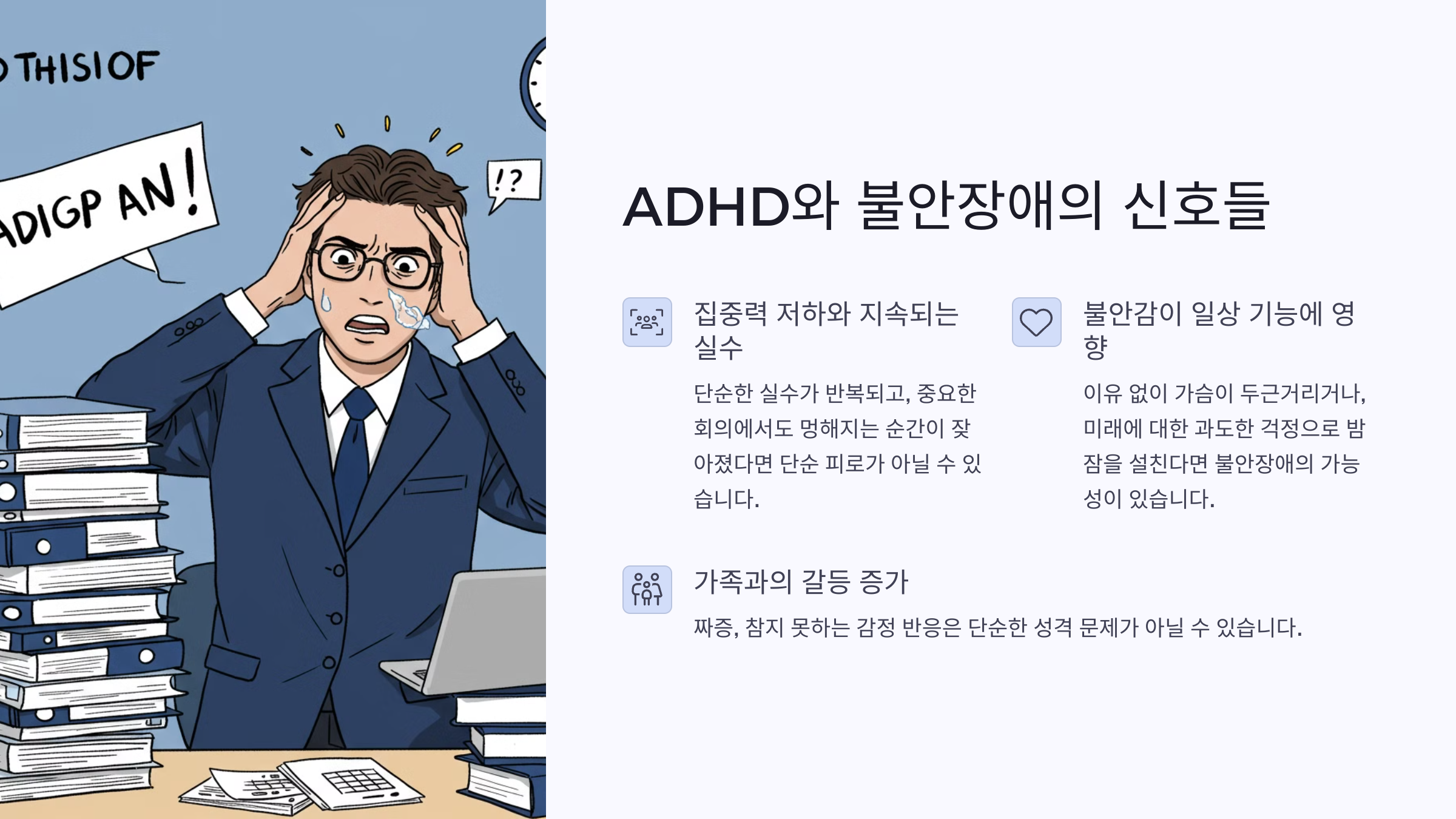 아침마다 출근 준비에 허덕이고, 집중은 되지 않는데 불안은 커져만 갑니다. 책임져야 할 일은 늘고, 나 자신은 점점 지쳐갑니다. 이런 현실 속에서 '나도 혹시 ADHD나 불안장애가 있는 건 아닐까?' 생각해 본 적 있으신가요? 특히 40대 이후의 직장인이라면 단순한 건망증이나 피로감으로 치부되기 쉬운 증상이 실제로는 정신 건강의 신호일 수 있습니다. 오늘 이 글은 바로 그 해답을 찾는 여정을 위한 시작입니다.