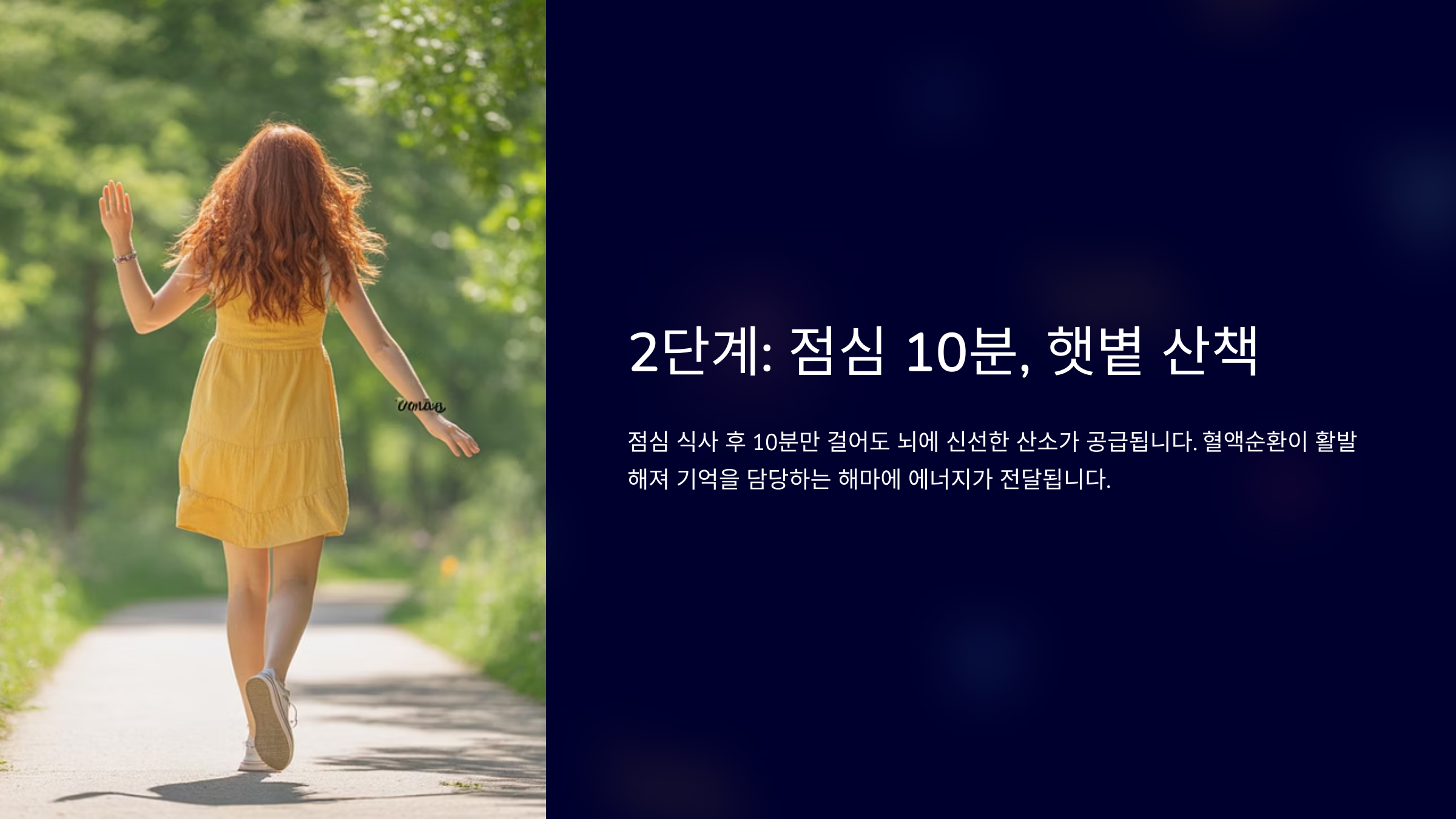 점심 직후 10분만 걸어도 뇌에 산소가 공급됩니다. 혈액순환이 활발해지고 기억을 담당하는 해마에 에너지가 전달됩니다.