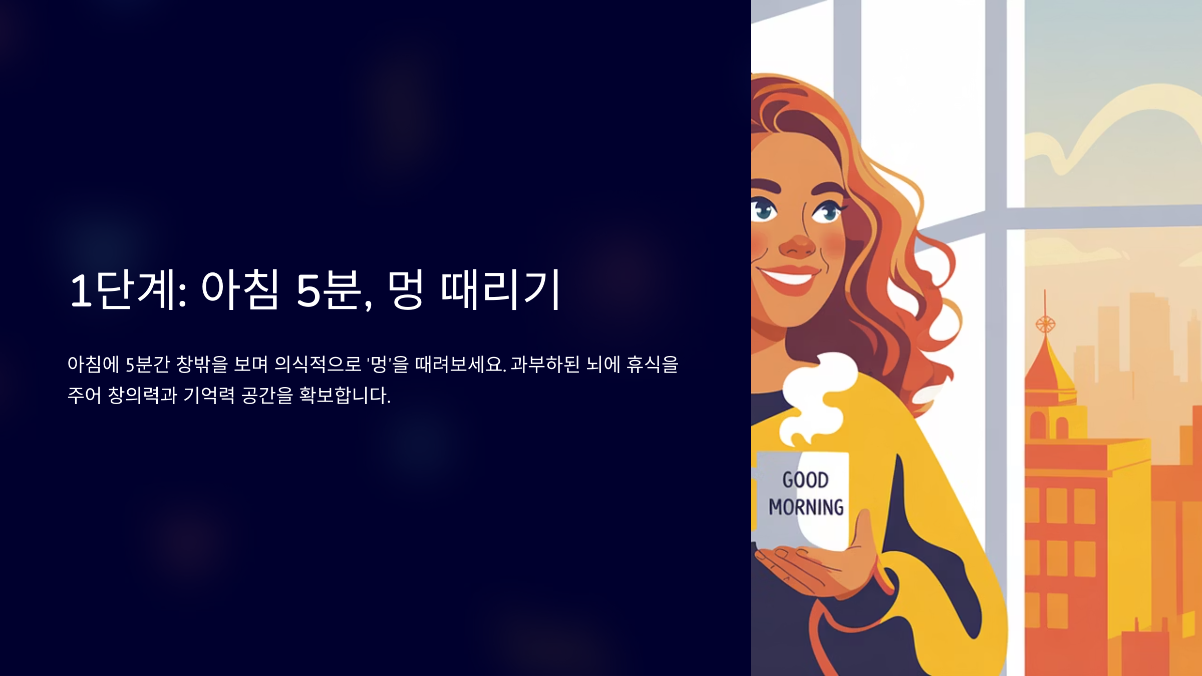 아침에 알람을 끄고 5분 정도 창 밖을 바라보며 아무 생각 없이 ‘멍’을 때려보세요. 과부하된 뇌가 휴식을 얻고 창의력과 기억력 저장 공간이 넓어집니다.