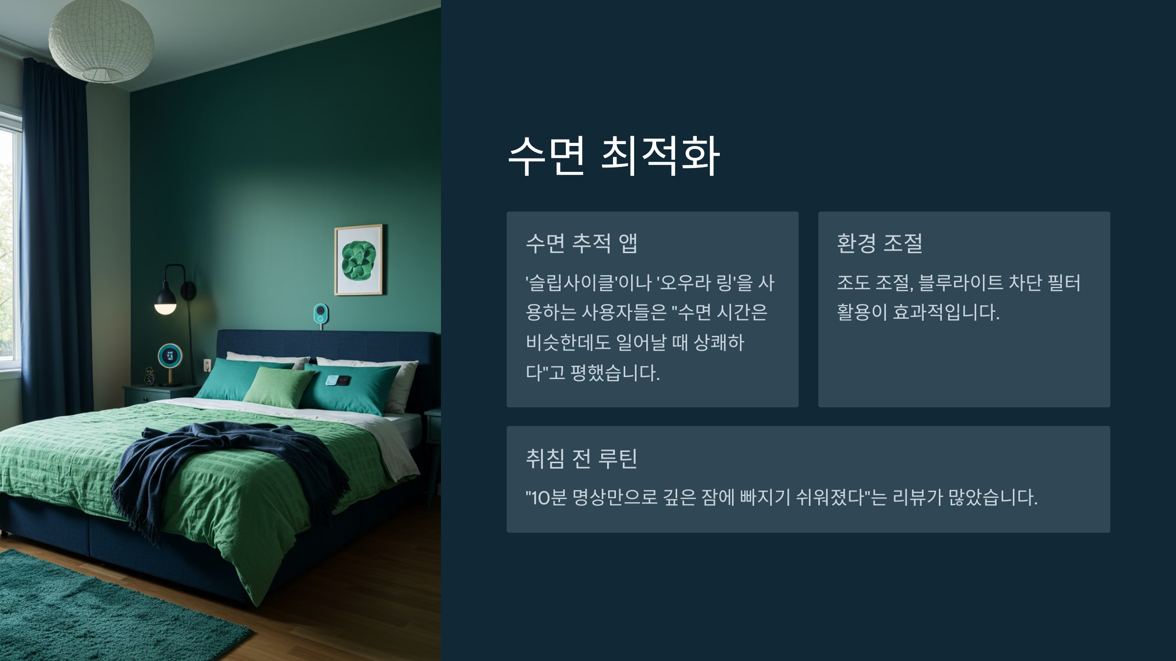 수면 관리 앱 ‘슬립사이클’이나 ‘오우라 링’을 사용하는 사용자들은 “수면 시간은 비슷한데도 일어날 때 상쾌하다”라고 평했습니다. 조도 조절, 블루라이트 차단 필터, 취침 전 명상 앱 활용 등도 실제로 사용자들이 많이 실천하고 있는 방법입니다. 특히 “10분 명상만으로 깊은 잠에 빠지기 쉬워졌다”는 리뷰는 바쁜 직장인들에게 강한 공감을 얻었습니다.