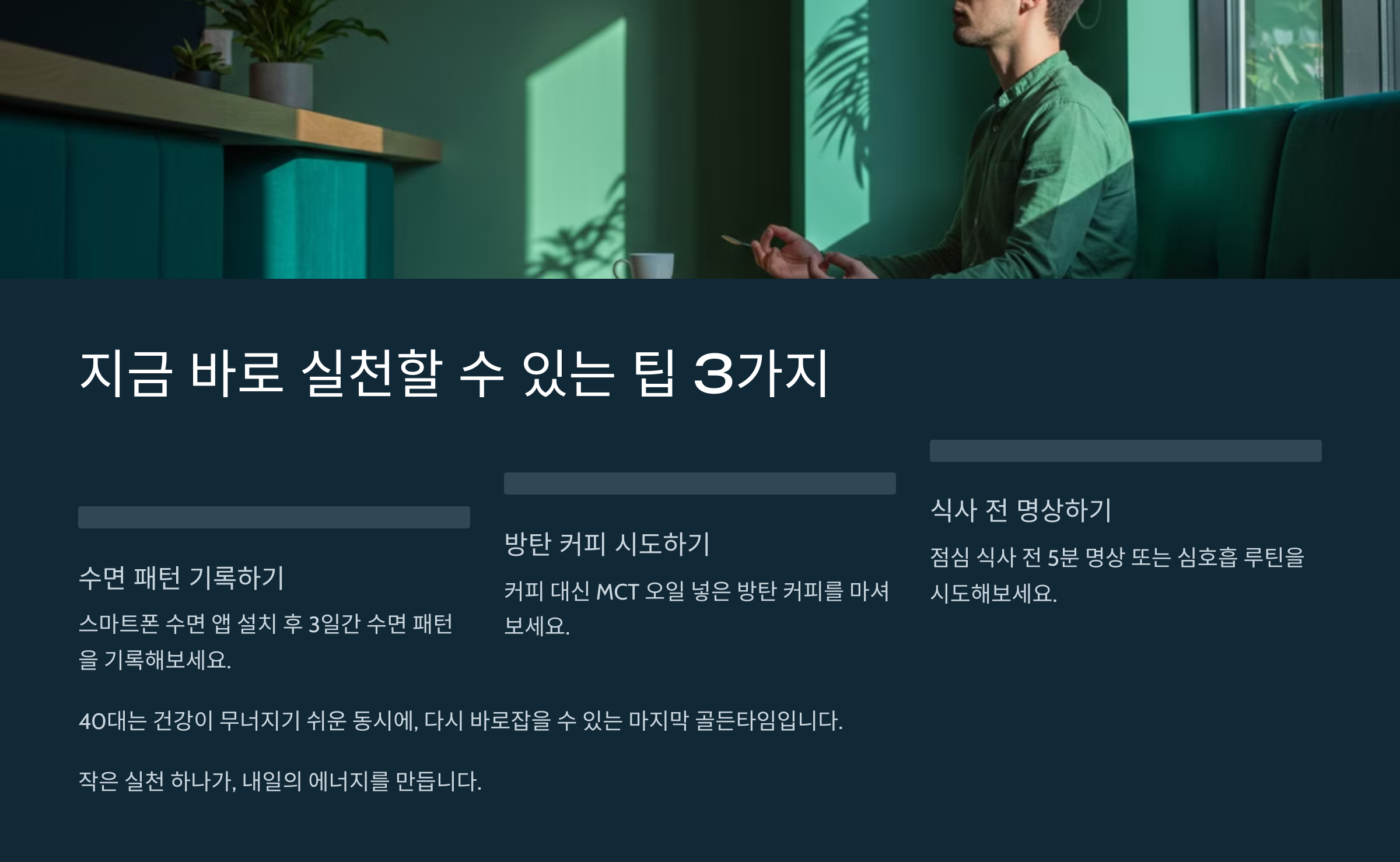 40대는 건강이 무너지기 쉬운 동시에, 다시 바로잡을 수 있는 마지막 골든타임입니다. 바이오해킹은 거창한 기술이 아닌 작고 일상적인 습관의 변화에서 출발합니다. 당신의 건강은 지금 당장 바뀔 수 있습니다. 작은 실천 하나가, 내일의 에너지를 만듭니다.