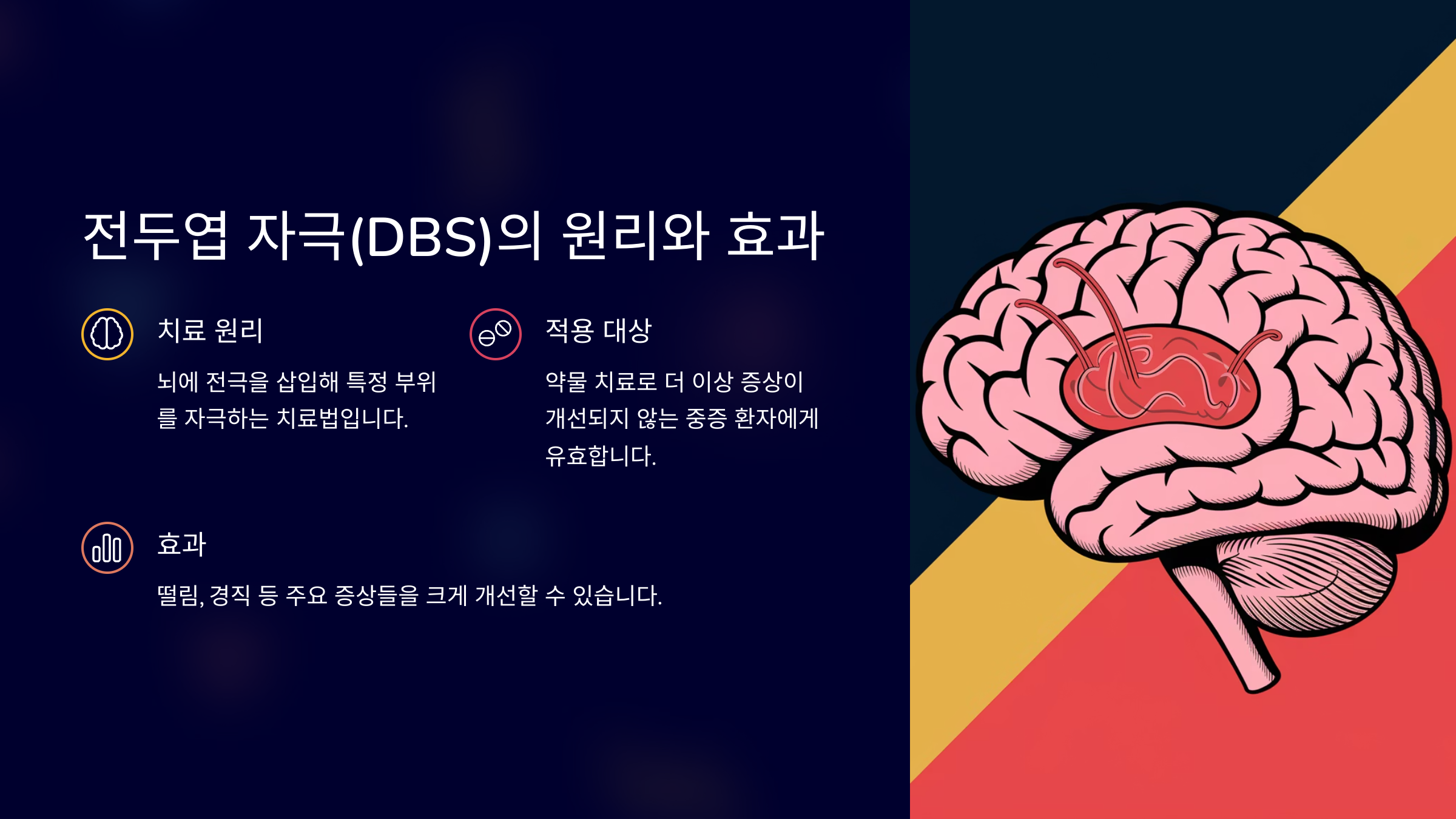 DBS 치료는 약물 치료로는 더 이상 증상이 개선되지 않는 중증 파킨슨병 환자에게 유효합니다. DBS 수술 후, 환자들은 더욱 원활한 움직임을 회복하고, 떨림, 경직 등 주요 증상들을 크게 개선할 수 있습니다. 이 치료법은 뇌에서 직접 전기 자극을 주어 파킨슨병의 주요 원인인 신경의 비정상적인 활동을 조절하기 때문에 효과적인 결과를 기대할 수 있습니다. 그러나 수술이 필요하므로, 일부 환자들은 수술에 대한 두려움이나 부담을 느낄 수 있습니다.