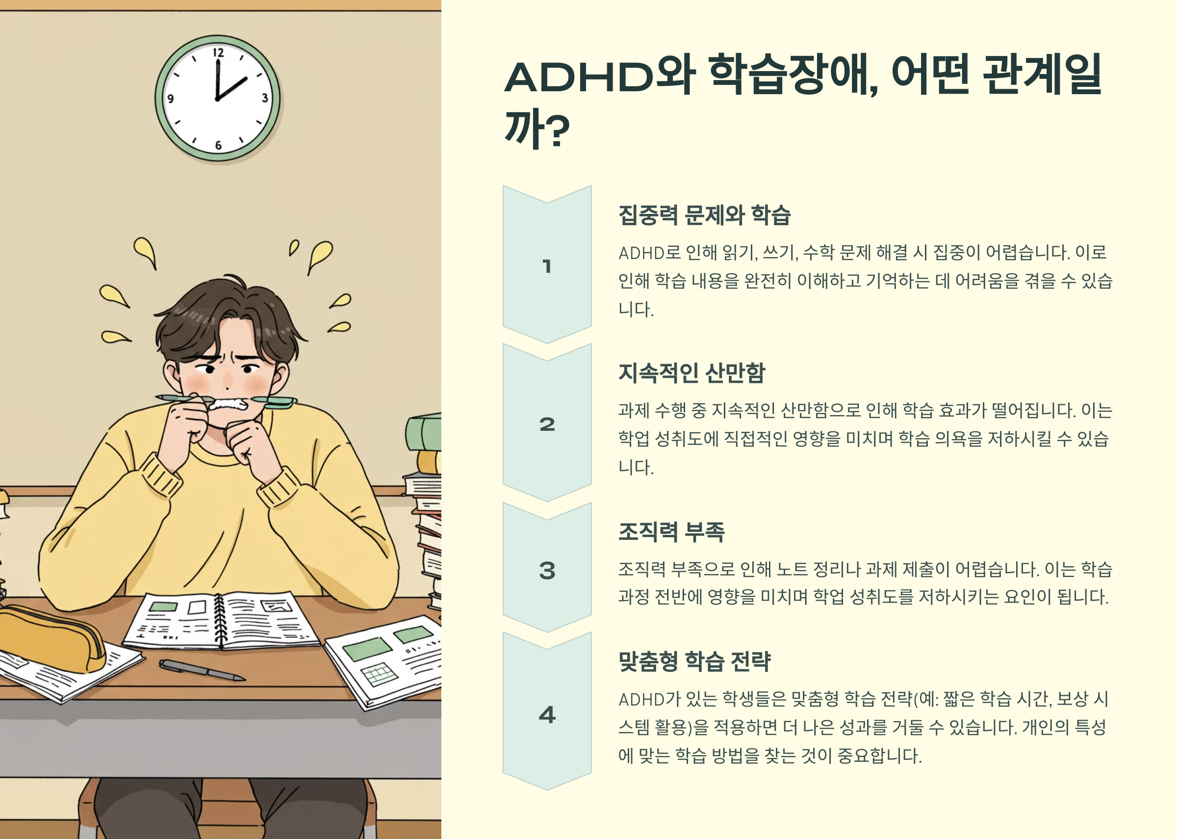 - ADHD로 인해 읽기, 쓰기, 수학 문제 해결 시 집중이 어렵다