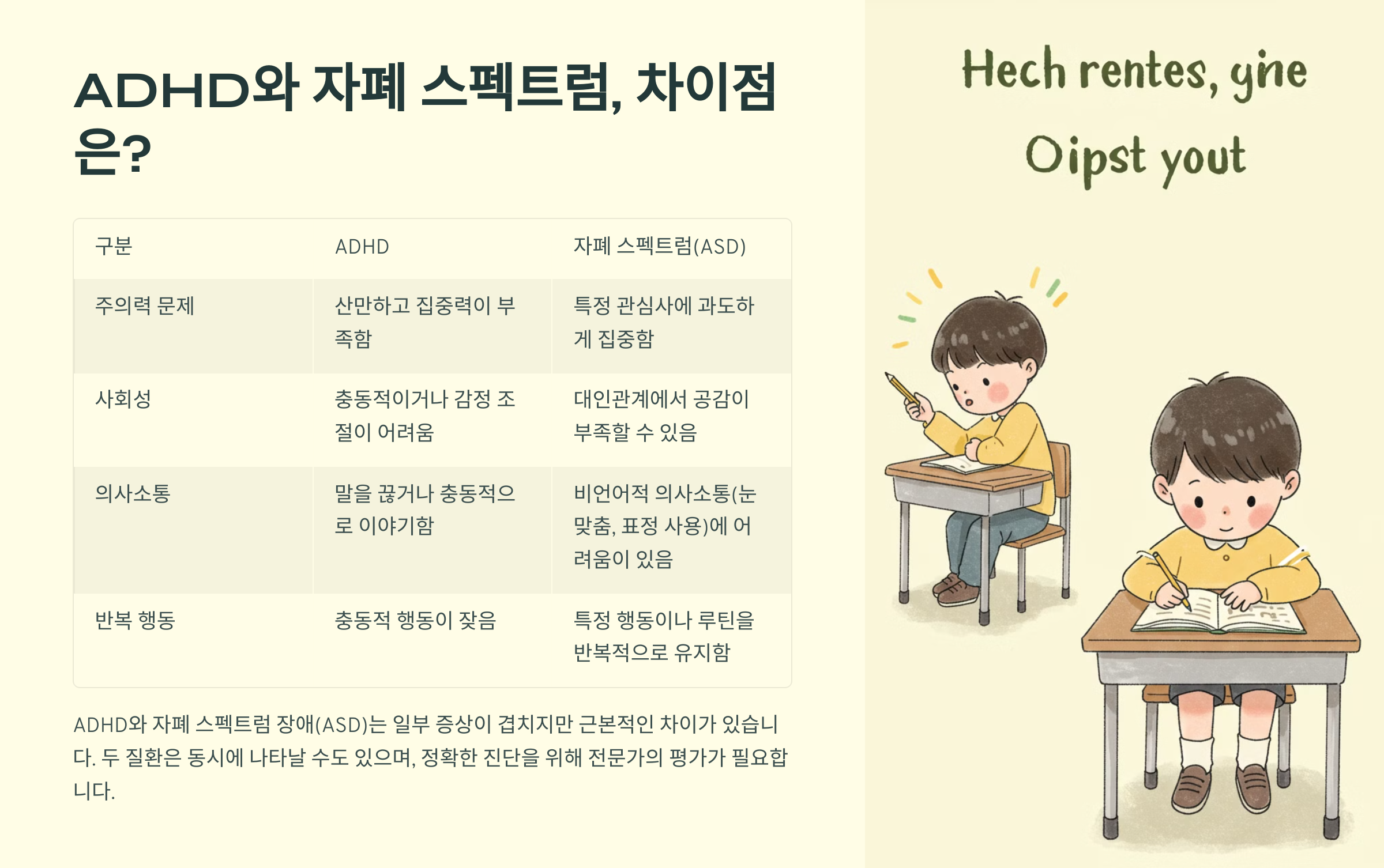 ADHD와 자폐 스펙트럼 장애(ASD)는 일부 증상이 겹치지만 근본적인 차이가 있습니다.