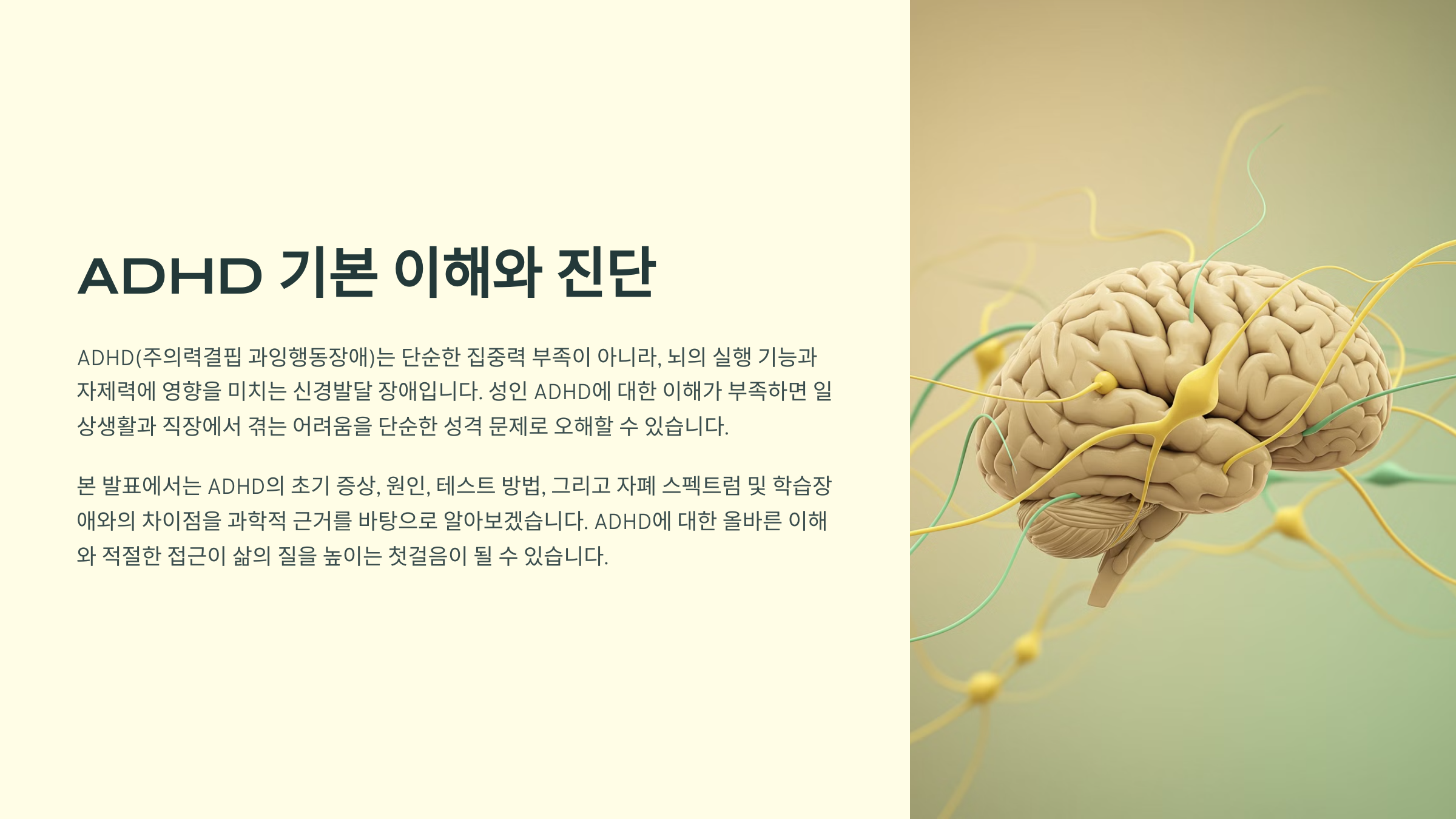 ADHD는 단순한 산만함이나 성격적 문제가 아니라 신경발달 장애로, 적절한 치료와 관리가 필요합니다. 초기 증상을 인지하고 전문가의 도움을 받는 것이 중요합니다.