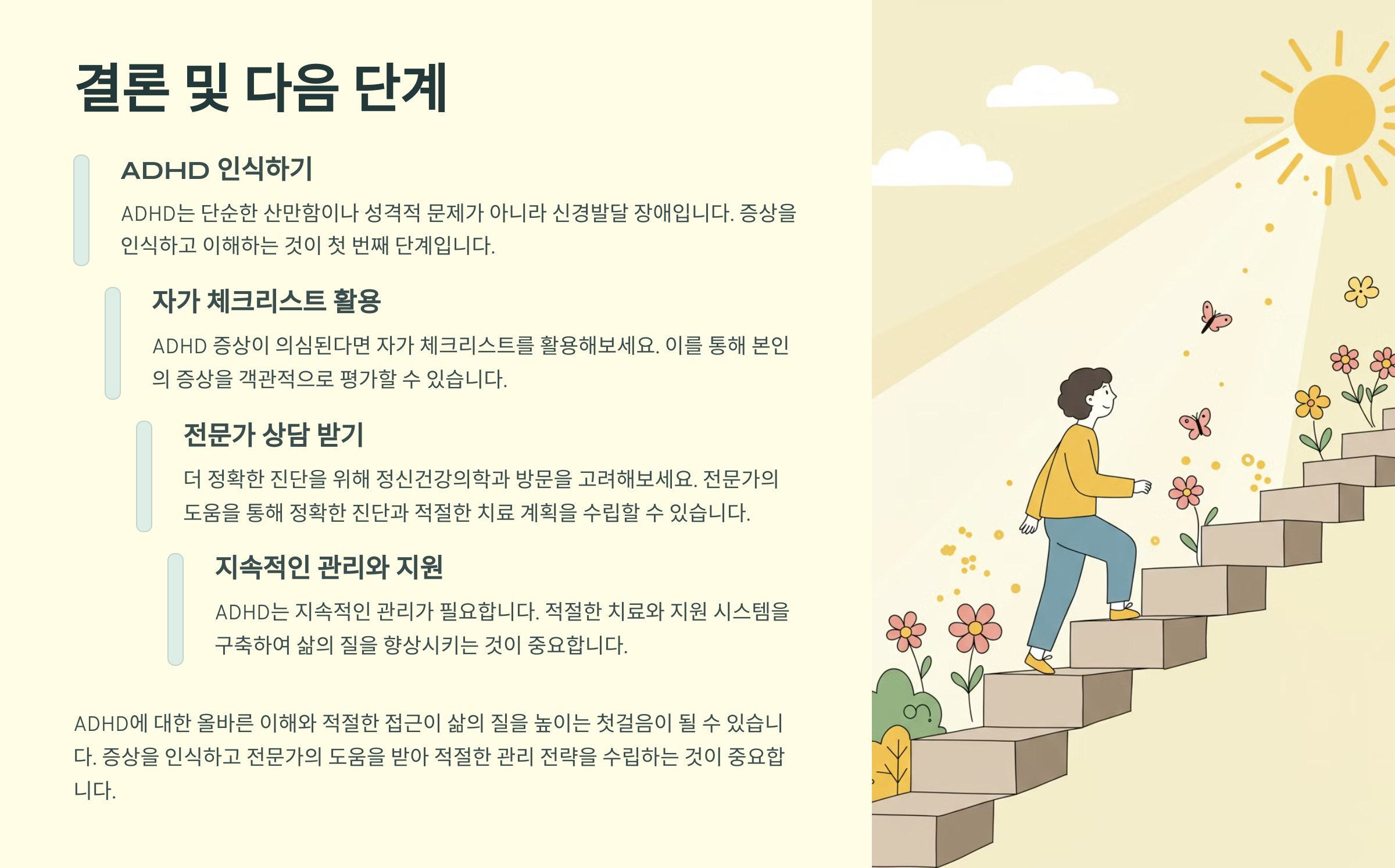 ADHD에 대한 올바른 이해와 적절한 접근이 삶의 질을 높이는 첫걸음이 될 수 있습니다.