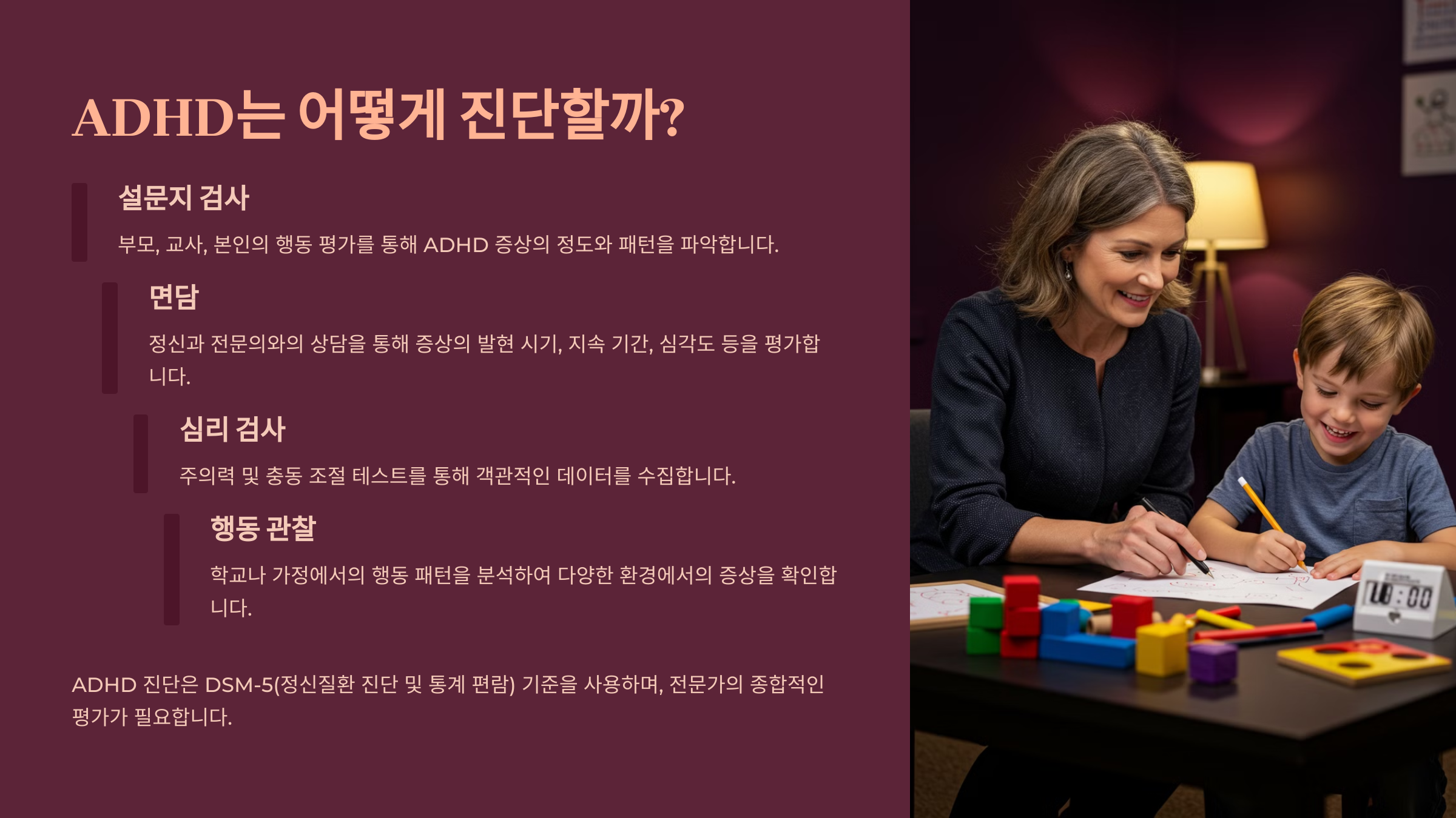 ADHD 진단은 DSM-5(정신질환 진단 및 통계 편람) 기준을 사용하며, 다음과 같은 방법으로 평가됩니다.