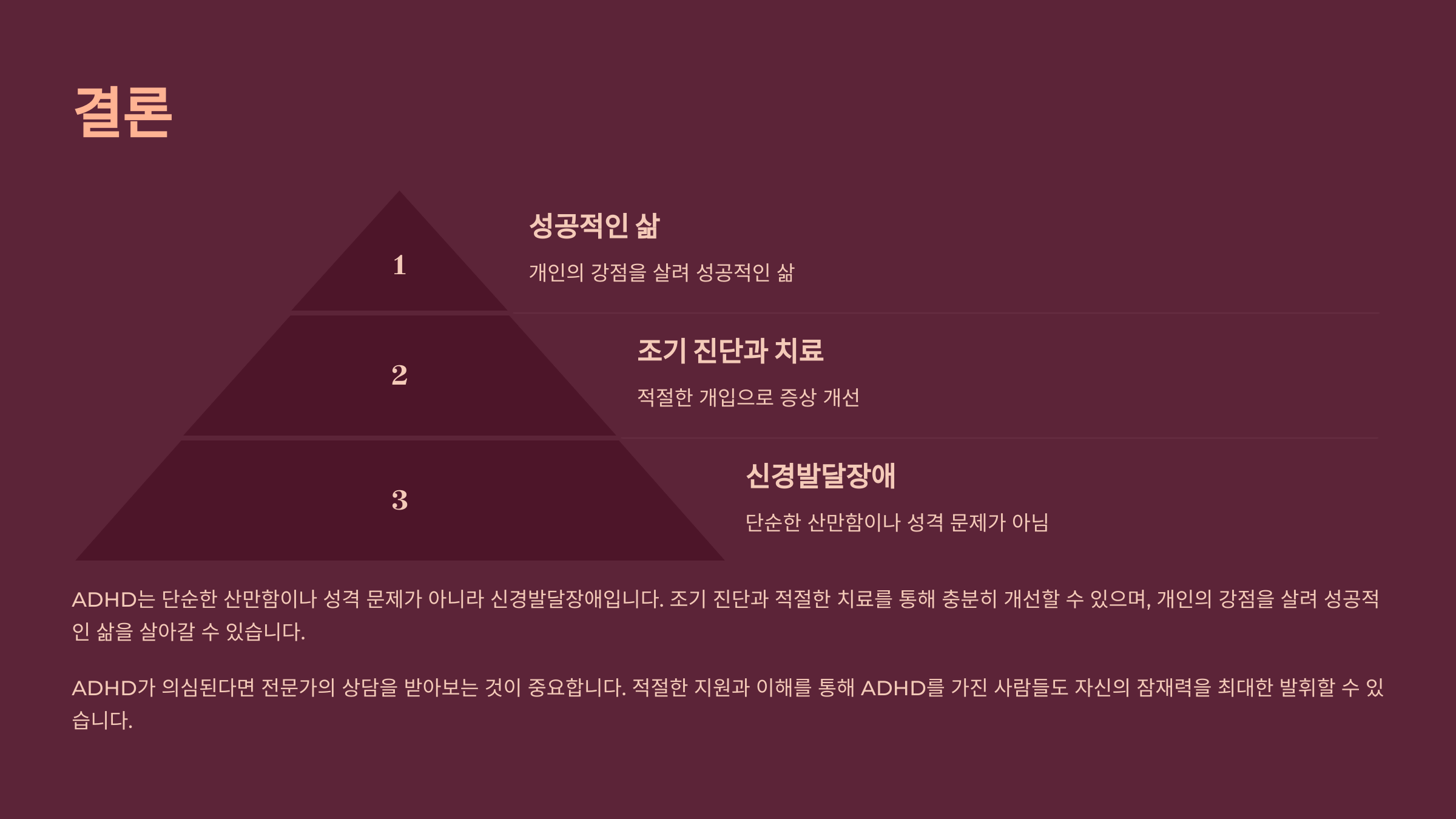 ADHD는 단순한 산만함이나 성격 문제가 아니라 신경발달장애입니다. 조기 진단과 적절한 치료를 통해 충분히 개선할 수 있으며, 개인의 강점을 살려 성공적인 삶을 살아갈 수 있습니다. ADHD가 의심된다면 전문가의 상담을 받아보는 것이 중요합니다.