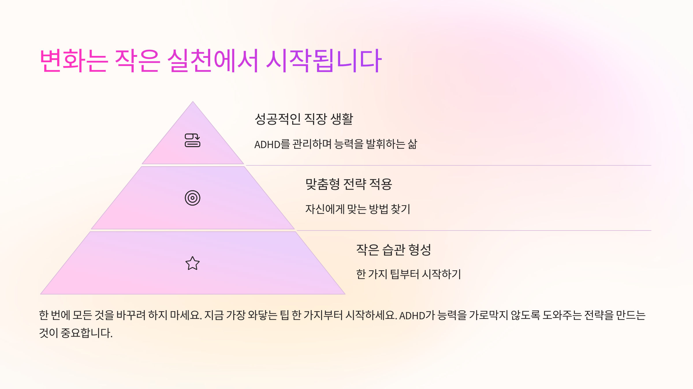 ADHD가 있다고 해서 직장 생활에서 성공할 수 없다는 뜻은 아닙니다. 오히려 자신의 패턴을 이해하고 맞춤 전략을 세운다면 누구보다 효율적으로 일할 수 있습니다. 오늘 소개한 방법들은 단순한 팁이 아닌, 실제 사용자 리뷰와 데이터에 기반한 전략입니다. 한 번에 다 바꾸려 하지 말고, 지금 이 순간 가장 와닿는 팁 한 가지부터 시작해 보세요.