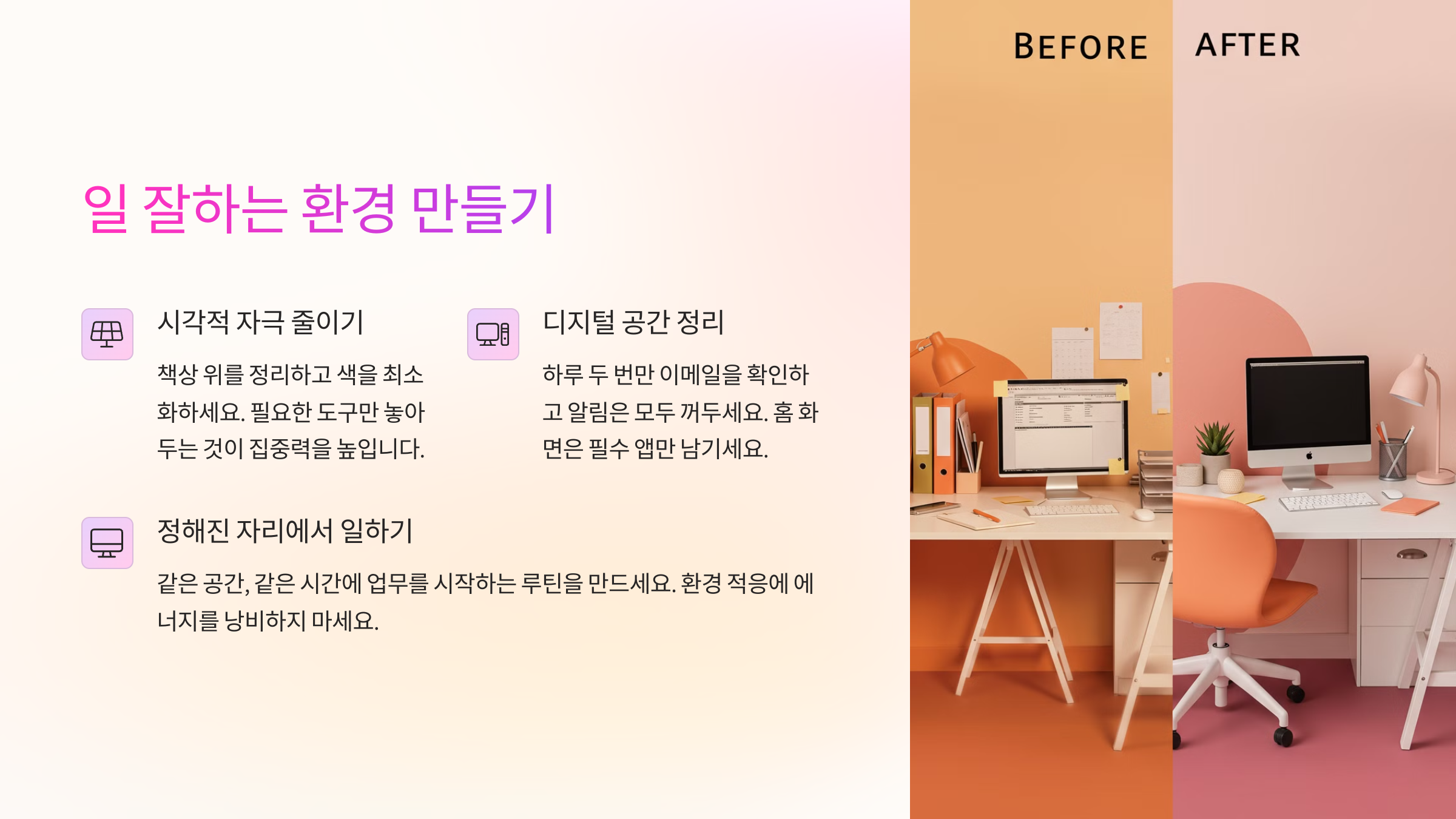 카페, 거실, 사무실 등 장소를 자주 바꾸면 뇌는 환경에 적응하느라 에너지를 소모합니다. 가능한 한 정해진 공간, 같은 시간에 업무를 시작해 '일하는 모드'로 전환되는 루틴을 만들어보세요.