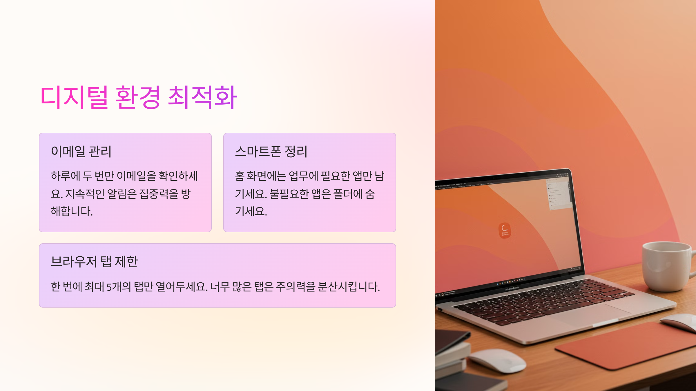 이메일, 알림, 수십 개 열린 브라우저 창. 디지털 환경 역시 주의력에 영향을 줍니다. 하루 두 번 이메일 확인 시간만 정해두고, 알림은 모두 꺼두는 것이 좋습니다. 특히 스마트폰의 홈 화면은 업무에 필요한 앱만 남기고 정리하세요.