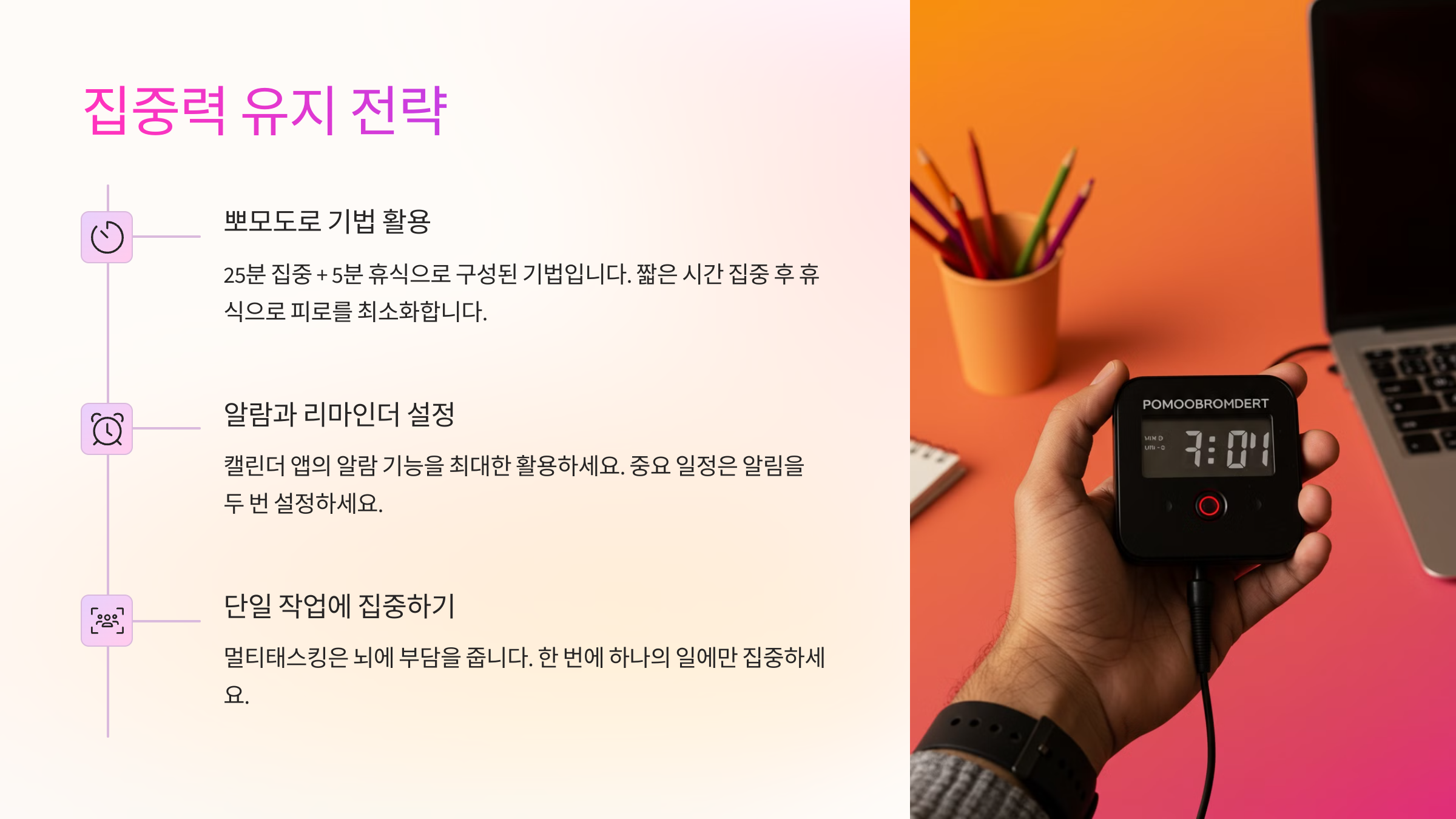 뽀모도로 기법은 작업의 효율성을 높이고, 집중력을 유지하는 데 도움을 줍니다. 타이머를 사용하여 시간을 측정하고, 작업 목록을 미리 작성함으로써 목표를 명확히 할 수 있습니다. 이 방법은 특히 주의 산만이 많은 환경에서 유용하며, 작업 중간에 짧은 휴식을 통해 정신적 피로를 줄이고 재충전할 수 있는 기회를 제공합니다.