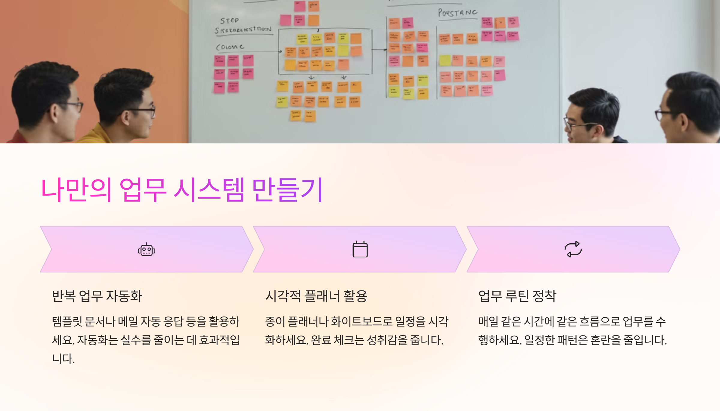 본인의 ‘골든타임’을 파악하세요. 어떤 사람은 오전 10시~11시 사이 집중력이 가장 높고, 어떤 사람은 오후에 성과가 좋습니다. 중요한 업무는 이 시간대에 배치하고, 단순 반복 업무는 에너지 떨어지는 시간대에 하면 효율적입니다.