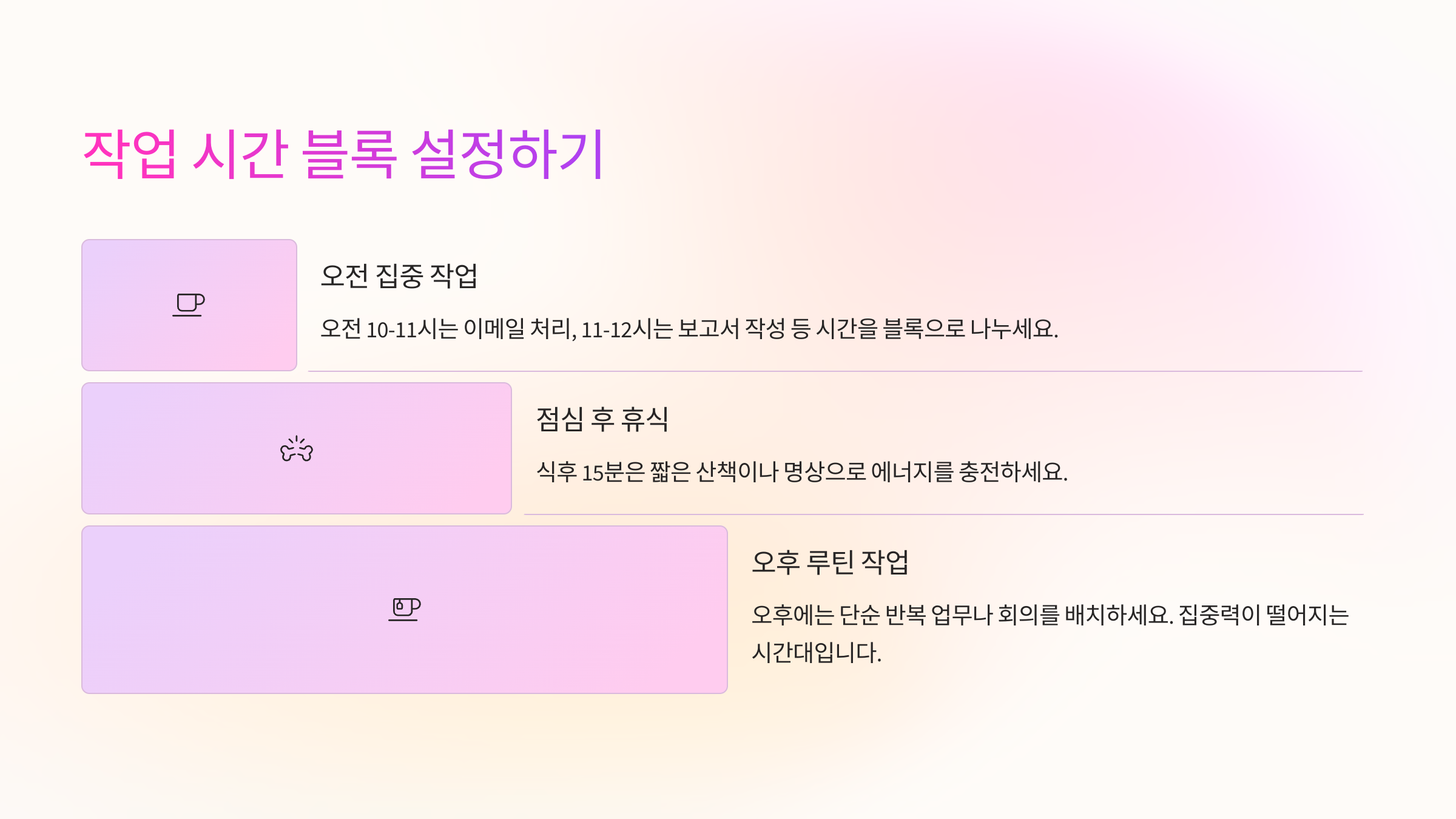 본인의 ‘골든타임’을 파악하세요. 어떤 사람은 오전 10시~11시 사이 집중력이 가장 높고, 어떤 사람은 오후에 성과가 좋습니다. 중요한 업무는 이 시간대에 배치하고, 단순 반복 업무는 에너지 떨어지는 시간대에 하면 효율적입니다.