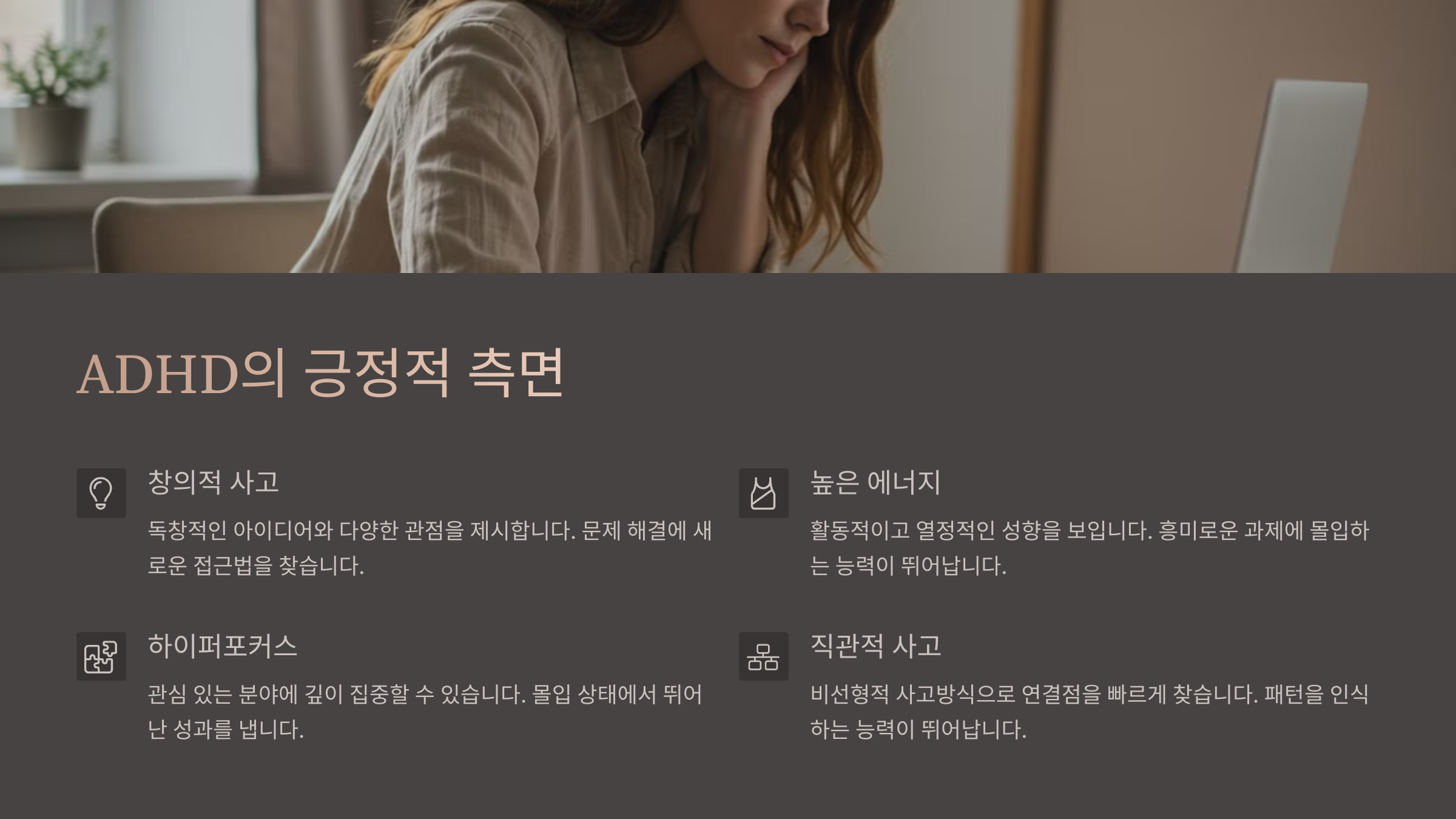 전통적으로 ADHD는 부정적인 시각에서 다루어졌지만, 최근 연구들은 창의성, 문제 해결 능력, 독창적인 사고와 같은 ADHD의 강점에 주목하고 있습니다.