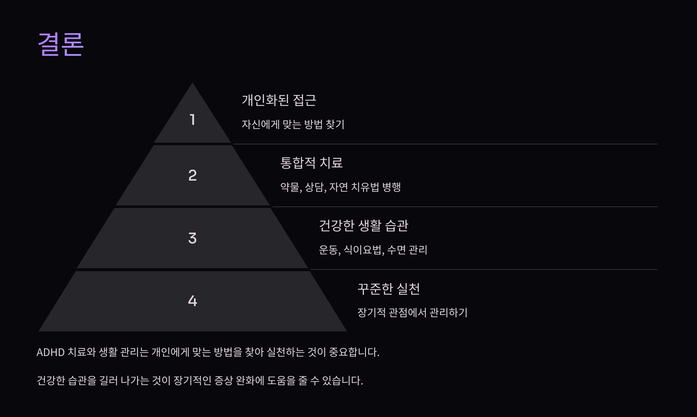 ADHD 치료와 생활 관리는 개인에게 맞는 방법을 찾아 실천하는 것이 중요합니다. 약물 치료, 상담, 자연 치유법을 병행하며 건강한 습관을 길러 나가는 것이 장기적인 증상 완화에 도움을 줄 수 있습니다. ADHD를 효과적으로 관리하고 삶의 질을 높이는 방법을 꾸준히 실천해 보세요!