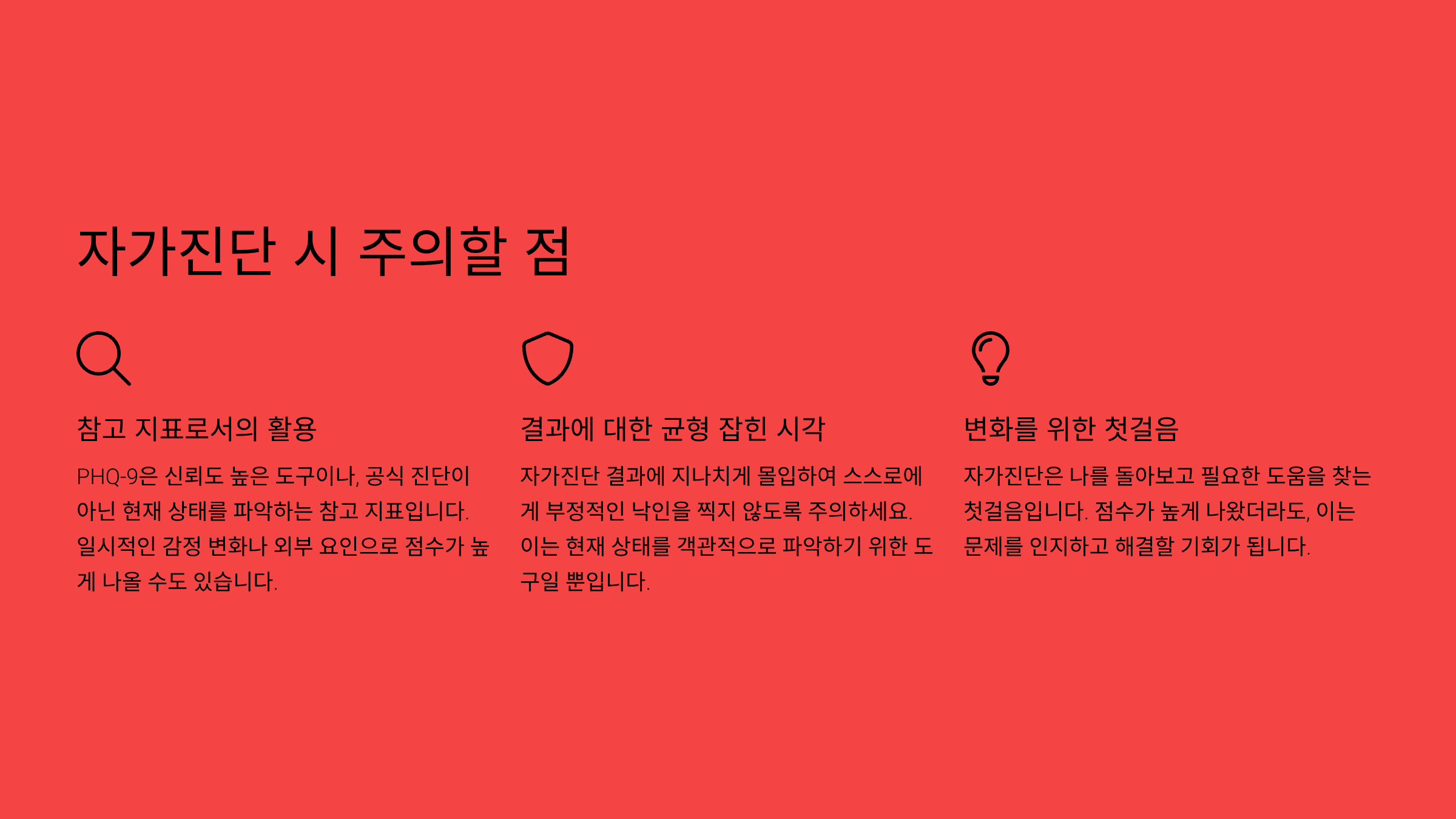 PHQ-9은 단순한 체크리스트가 아니라, 감정·행동·인지·신체 증상을 포괄적으로 평가합니다. 설문 결과만으로 진단이 확정되는 건 아니지만, 자신의 상태를 점검하는 데 매우 유용합니다.
