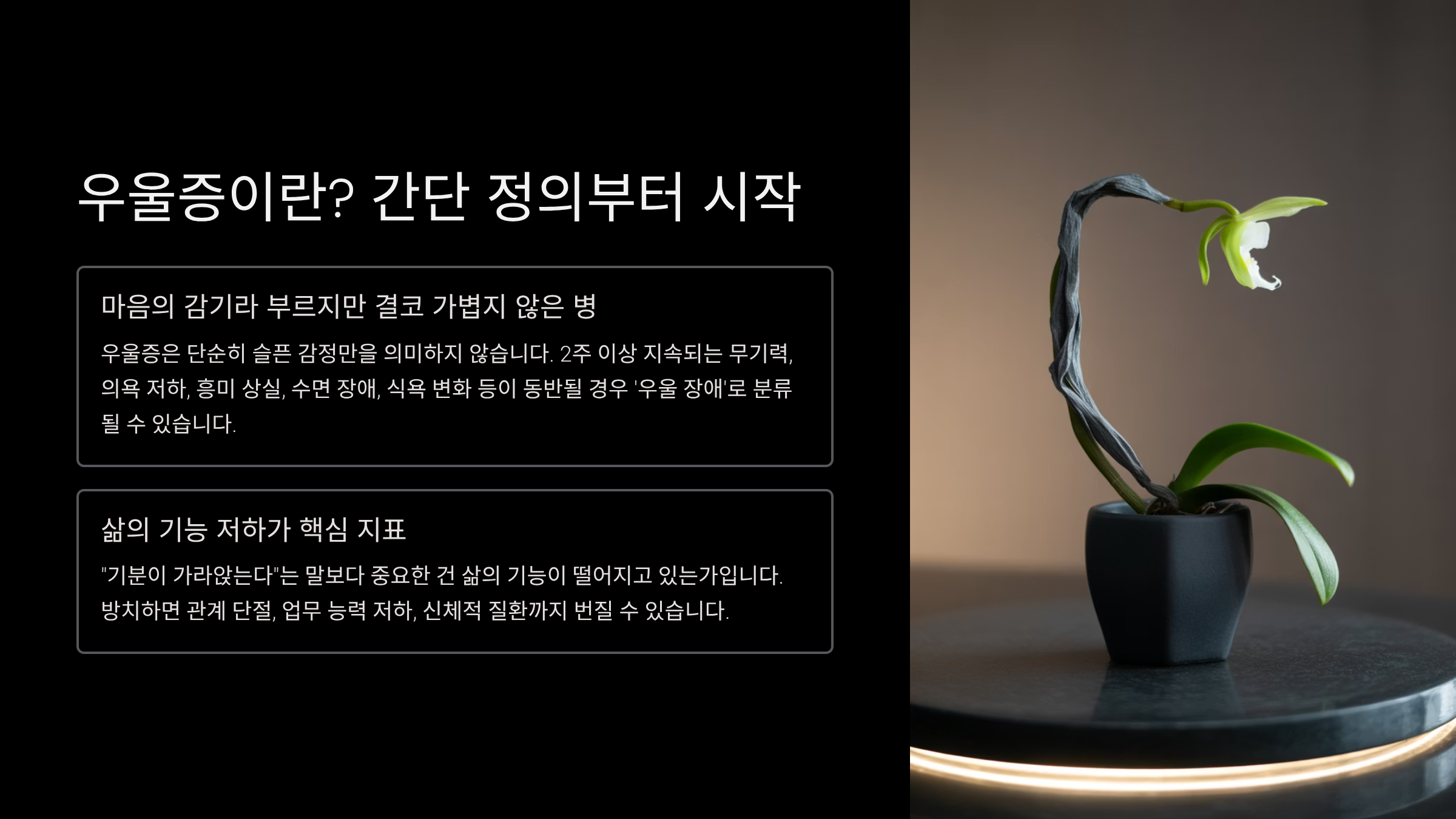 우울증은 단순히 슬픈 감정만을 의미하지 않습니다. 2주 이상 지속되는 무기력, 의욕 저하, 흥미 상실, 수면 장애, 식욕 변화 등이 동반될 경우 '우울 장애'로 분류될 수 있습니다. 특히 자신을 쓸모없다고 느끼거나 삶에 대한 의욕이 현저히 떨어진다면 적극적인 대응이 필요합니다.